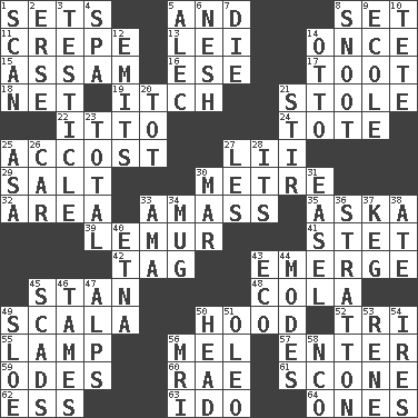 ACROSS 1. Puts into a specified state 5. Also 8. Arrange properly for use 11. Streamer paper 13. Luau accessory 14. At one time in the past 15. Indian state 16. Compass dir. 17. A blast of a horn 18. Fish or hair follower 19. Hankering 21. Fur scarf 22. "Tell ____ the Marines!" 24. Carry 25. Buttonhole 27. Cards in a Roman deck? 29. Table seasoning 30. Distance measurement (Brit.) 32. Length times width 33. Collect or gather 35. "____ silly question..." 39. Arboreal primate 41. Proofreading order 42. Label 43. Develop 45. Comedian Laurel of Laurel & Hardy 48. Root beer relative 49. Any of the three canals of the cochlea 50. Parka part 52. Three (prefix) 55. Desk light 56. Cartoonist voice _ Blanc 57. Keyboard key 59. Lyric poems 60. Actress Charlotte 61. Biscuitlike quick bread 62. Curvy letter 63. Wedding promise 64. Singles DOWN 1. Glance over 2. Celtic language 3. A testis 4. Health resort 5. Actor Baldwin 6. Delicate 7. Pass on 8. Snob 9. Learning spot: Fr. 10. False hair 12. Sends forth 14. "Beetle Bailey" pooch 20. Small child 21. Disorderly outburst 23. Add up to 25. White ___ sheet 26. Auto 27. French article 28. It is 30. Third mo. 31. Artist's stand 33. Nursemaid (var.) 34. Large cup 36. Ski resort town in Vermont 37. Cask 38. Had dinner 40. Inactive volcano in Sicily 43. Environmental prefix 44. Methods 45. Large numbers or amounts 46. Corrects by punishment or discipline 47. High mountains 49. A type of plum 50. Froth on beer 51. Margarine 53. French philosopher Descartes 54. Angers 56. Medical imaging device (abbr.) 58. Non-commissioned officer (abbr.)