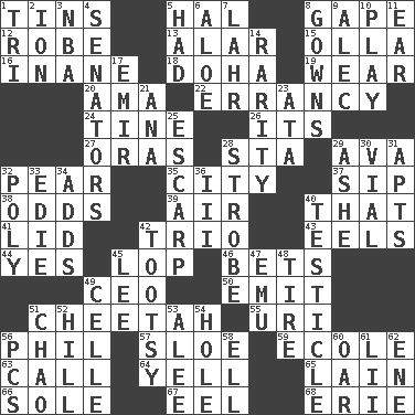 ACROSS 1. Canisters 5. Actor Linden 8. Open wide 12. Loose flowing garment 13. Having or resembling wings 15. Water jar 16. Lacking in sense or substance 18. Capital of the state of Qatar 19. Put on (as clothing) 20. Wet nurse (var.) 22. Tendancy to err 24. Prong on a fork 26. ___ a Wonderful Life 27. Mouths or openings 28. R.R. building 29. Actress Gardner 32. Lightbulb-shaped fruit 35. Municipality 37. Small drink 38. Likelihood 39. Wind 40. Not this but _ 41. Hat (slang) 42. Musical group of three 43. Snakelike fish 44. It is so 45. Trim (branches) 46. Wagers 49. Corporate head (abbr.) 50. Send forth 51. Leopard's kin 55. RI univ. 56. Silvers or Donahue 57. A type of plum 59. Learning spot: Fr. 63. Give a ring to 64. Shout 65. (Had) reclined 66. Flatfish 67. Snakelike fish 68. 4th largest of the Great Lakes DOWN 1. Three (prefix) 2. Electrically charged atom 3. Basketball assoc. 4. Legislators 5. Possessed 6. _ vera 7. Cowardly lion portrayer 8. Brides' dresses 9. Actor Baldwin 10. Live dramatic performance 11. Hearing organ 14. Noteworthy scarcity 17. Independent ruler or chieftain 21. Santa ___, CA 23. "One Day ___ Time" 25. Fortification 28. Disco prop 29. American tennis player Robert 30. Small bottle 31. Flats, for short 32. More than one (prefix) 33. Singer Brickell 34. Does sums 36. One more than two 40. One of the two male reproductive glands 42. A girl or young woman (variant) 45. Area sheltered from the wind 47. Australian flightless bird 48. Become fatigued 49. Cell (Danish) 51. US Secretary of Labor Elaine L. _ 52. Land elevation 53. Toward shelter 54. Hollow 56. Personal Computers (abbr.) 58. Pipe bend 60. Rowing implement 61. Cards in a Roman deck? 62. Compass dir.