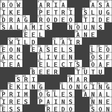 ACROSS 1. Arrow shooter 4. Operatic vocal solo 8. White ___ sheet 11. Mamie's husband 12. _ dish (used to culture cells) 14. Snaillike creature with no shell 15. To be drawn or hauled along 17. Cowboy competition 18. Event that recurs at intervals 19. Deli grouping 21. Parts of speech 23. Snakelike fish 24. One (Scot) 25. Uncontrolled 27. Den 30. A really long time 31. Artist's stands 34. Lion 37. Curve 38. Make or become more lively 39. Order of Saint Francis (abbr.) 40. Beverage made from leaves 41. Opts 43. Clumsy lout 44. Fermented drink made from hops 45. Ballerina skirt 47. _ Lanka 49. Spoil 50. Supplementing with great effort 52. Yearning 56. Demure 57. Stares 60. Of or related to the anus 61. Angers 62. Aches 63. Compass dir. 64. Double-curved letter 65. Redecorate 66. Manchild DOWN 1. Auction offers 2. Gumbo ingredient 3. Welt 4. Showery time 5. Vintage cars 6. It would 7. "We ___ not amused" (Victoria) 8. Place in a line 9. Beer foam 10. Mature 13. Electrically charged atom 14. Make senseless or dizzy 16. Highlander 20. Ancient Persian 22. Boat paddle 25. Had on 26. South American Indian 27. Prying instrument 28. Actor Baldwin 29. Is not 30. Consume 32. Toward shelter 33. Filth; sediment 34. Spoils 35. He sold his birthright 36. Below a satisfactory level 42. Comedian Laurel of Laurel & Hardy 44. Storage container 46. Capital and largest city of Mongolia 47. Atmospheres 48. Basketball hoops 49. With motion or animation 50. Blunders 51. Republican Party 52. Grant temporary use of 53. Restaurants 54. Billionth: prefix 55. Small, secluded valley 56. Sliced dessert 58. Slender fish 59. Whopper