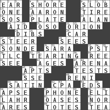 ACROSS 1. Hearing organ 4. Dinah or Pauly 9. Messy guy 13. Single 14. Composer Copland 15. Become fatigued 16. Mayday 17. Food holder 18. ____ Jay Lerner 19. Help 21. Bear (Spanish) 22. Greek mythologigal hunter 24. Claim 26. Automobile 27. Guide 29. Perceives with the eye 30. Something which is sent 31. "Two Mules for Sister ____" 33. Pacific Standard Time (abbr.) 36. Affectionate concern, for short 37. Lacerating 40. To sift 41. Perceive with the eye 42. Ripens 43. Sports stadium 45. Flats, for short 47. Trials 48. Compass dir. 49. Painter Guido (1575-1642) 50. Smooth fabric 52. Tax preparer (abbr.) 54. Begley and Asner 56. Domed church section 57. Give a jingle 59. Connecticut Ivy Leaguer 61. Cowardly lion portrayer 62. Fertile tracts in a desert 63. Not either 64. Ancient Greek god of war 65. Hauls 66. Afternoon social gathering DOWN 1. Greek goddess of the dawn 2. Small Philippine buffalo 3. Home 4. Plant excrement 5. Radiant circles of light 6. Mouths or openings 7. Printing process, for short 8. Compass dir. 9. Flight of steps 10. _ and Stitch 11. NW Algerian seaport 12. Benjamin's nick name 20. Passed on 22. Sea 23. Actress Charlotte 25. Cy Young winner Saberhagen 27. Fast planes 28. Lacquered or enameled metalware 29. Indian titles of respect 31. Droops 32. "We ___ not amused" (Victoria) 33. Elected leader of a country 34. Transmitted 35. Afternoon social gatherings 38. Ingested 39. Yard entry 44. French philosopher Descartes 45. Michaelmas daisies 46. 23rd letter of the Greek alphabet 49. The wife of a rajah (variant) 50. Coast Guard woman 51. American tennis player Robert 52. US Secretary of Labor Elaine L. _ 53. Mail 55. _ gin 56. Insect wing 57. Plant holder 58. Curvy letter 60. Retirement account (abbr.)