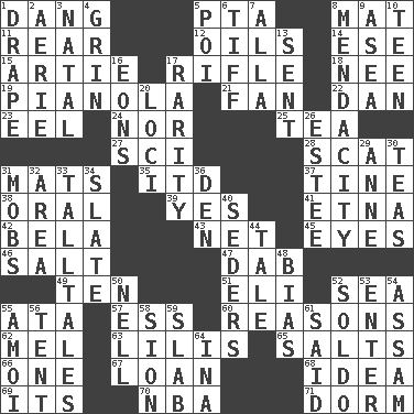 ACROSS 1. Mild oath, euphamism for damn 5. Parent Teacher Assoc. 8. Floor covering 11. Tail end 12. Lubricates 14. Compass dir. 15. Nick name for Arthur 17. Ransack; plunder; pillage 18. Born 19. Player piano 21. Avid follower 22. One of the 12 tribes of Israel 23. Snakelike fish 24. Not either 25. Afternoon social gathering 27. _-fi 28. Scram! 31. Floor protectors 35. It would 37. Prong on a fork 38. Of the mouth 39. It is so 41. Inactive volcano in Sicily 42. Actor Lugosi 43. Fish or hair follower 45. Sight organs 46. Table seasoning 47. Pat or tap gently 49. Nine, plus one 51. Connecticut Ivy Leaguer 52. Ocean 55. "One Day ___ Time" 57. Double-curved letter 60. Thinks logically 62. Cartoonist voice _ Blanc 63. Ms. Damita and namesakes 65. Table seasonings 66. Single 67. Grant temporary use of 68. It may be bright or harebrained 69. It is 70. Basketball assoc. 71. Dormintory (informal) DOWN 1. Window treatment 2. Nest on high 3. Relating to or accompanying birth 4. Broad smile 5. Luau course 6. Small quarrel 7. Silent film actress Nazimova 8. Ananias' fault 9. Toward the sea 10. Adolescent 13. Posted 16. Immeasurably long periods of time 17. Noteworthy scarcity 20. Locales 26. First name in cosmetics 29. Singer Murray 30. Afternoon social gatherings 31. Disorderly crowds 32. Length times width 33. Baron Munchausen's specialties 34. Chalkboard 36. Lair 40. Spring feasts 44. Falsehood 48. Prejudice 50. 1994 drama film starring Jodie Foster 52. Twentieth part of a lira 53. Keyboard key 54. Indian state 55. Mine, in Marseilles 56. Portable shelter 58. The Jewish people; Israel 59. Broad, flat, thick piece 61. Alleged 64. _ tizzy (2 wds.)