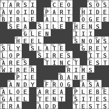 ACROSS 1. Tarsus (plural) 6. Corporate head (abbr.) 9. Distress signal 12. Prevent from happening 13. Piece 14. Flintstone garb 15. God's Word 16. Came down and settled, as after flight 17. Double curve, resembling the letter S 18. Ocean 19. Drop; flow; fall 20. Coop moms 21. Small, secluded valley 23. One more than two 24. The bottom of a shoe or boot 25. Overwhelms 28. Secret 30. Chalkboard 34. Jennifer or Joel 35. Trim (branches) 36. Titles for men of rank and authority 38. ___ a Wonderful Life 39. Ancient Greek god of war 41. Tinged 43. Eastern Standard Time (abbr.) 44. One who wires 46. Basketball hoops 48. Sliced dessert 49. Object of repulsion 50. Actor Griffith 51. Toadlike animal 53. White ___ sheet 56. _ vera 57. Type of rug 58. First-year military academy student 60. Highlander 61. Portable shelter 62. Locates 63. Epoch 64. Find the sum of 65. Trials DOWN 1. Keyboard key 2. Advice 3. Loose flowing garment 4. Fodder prepared in a silo 5. Binary compound 6. Give a ring to 7. 4th largest of the Great Lakes 8. Baseball player Mel 9. Seigniories (variant) 10. Lyric poems 11. Perceive with the eye 13. Ache 14. Weeding 19. Makes a sale 20. Part of HMS, perhaps 22. French article 24. Abnormally rapid or deep breathing 26. Soaks 27. System (abbr.) 28. Cole _ (cabbage dish) 29. Australian parrot (variant) 31. Small island 32. Three (prefix) 33. Car or cant ending 37. Lean end of the neck 40. A glass for beer 42. Shallow baking pan 45. Marina Del _, California 47. Ear of corn 49. Water vessel 50. Having or resembling wings 51. Flintstone 52. Tear apart 54. Puts into a specified state 55. Collude with 56. Grow older 57. _ moment's notice (2 wds.) 58. Pacific Standard Time (abbr.) 59. Double-curved letter