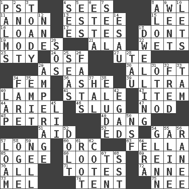 ACROSS 1. Pacific Standard Time (abbr.) 4. Observes 8. Leather borer 11. At once, immediately (arch.) 13. First name in cosmetics 15. Area sheltered from the wind 16. Grant temporary use of 17. _____ Park, CO 18. Do not 19. Methods 21. In the manner of 22. Soaks 23. Filthy place 24. Order of Saint Francis (abbr.) 27. Shoshoni 29. Toward the sea 30. High up in or into the air 34. Opposite of masc. 36. American tennis player Robert 39. Extremist 40. Desk light 41. Having lost freshness 43. A distinct part 44. Satellite of Uranus 46. Strike heavily 47. Lower and raise head in agreement 48. _ dish (used to culture cells) 49. Mild oath, euphamism for damn 51. Assist 53. Begley and Asner 54. Slender fish 57. Protracted 60. The grampus (Milton) 63. Man or boy (slang) 65. Double curve, resembling the letter S 66. Plunders 69. It's straight from the horse's mouth 70. Everything 71. Lugs 72. Queen of England 1702-14 73. Cartoonist voice _ Blanc 74. Portable shelter 75. Born DOWN 1. Insides of hands 2. Snout, nose 3. Sycophant 4. Observe 5. Double-curved letter 6. Singer James 7. Sew up the eyelids of hawks and falcons 8. _ vera 9. Gone 10. Allows 12. Compass dir. 14. Son of Isaac 18. Home 20. Distress signal 25. Oceans 26. Goes without food and/or water 28. The 19th letter of the Greek alphabet 29. Electrical Measurement 31. Von Bismarck 32. Flintstone 33. Scottish cap 34. Conductor's collection 35. Send forth 37. Actor Linden 38. Evade 40. Pet locale 42. Mild oath 45. Cards in a Roman deck? 50. Science/research agcy. 52. Stupid person 54. American astronaut and politician John 55. Place in a line 56. The wife of a rajah (variant) 57. Rich soil 58. Stare 59. 1994 drama film starring Jodie Foster 61. Carrot, for example 62. ____ d'Azur (French Riviera) 64. Epoch 67. Nine, plus one 68. Fast jet (abbr.)