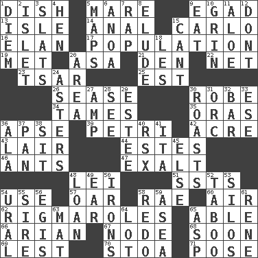 ACROSS 1. Food container 5. Female horse 9. Mild oath 13. Small island 14. Of or related to the anus 15. Monte _, Las Vegas Hotel/Casino 16. Style 17. Census information 19. Was introduced to 20. White ___ sheet 21. Lair 22. Remaining after all deductions 23. Russian ruler of old 25. Eastern Standard Time (abbr.) 26. Gospel singer Marvin 30. Loose flowing garment 34. Domesticates 35. Mouths or openings 36. Domed church section 39. _ dish (used to culture cells) 42. 1/640 square mile 43. Den 44. _____ Park, CO 46. Pismires 47. Glorify 48. Luau accessory 51. Fast planes 54. Purpose 57. Rowing implement 58. Actress Charlotte 60. Atmosphere 62. Complicated, petty procedures 65. Competent 66. Believer in; advocate of (suffix) 67. Connecting point 68. Within a short period 69. For fear that 70. Portico 71. Airs DOWN 1. South Vietnam president (1954) 2. Small island 3. Narrow boards 4. Layer 5. Atlas contents 6. Small Philippine buffalo 7. Reproach for some lapse or misdeed 8. Evade 9. Consume 10. Broad smile 11. Medicinal plant 12. Do not 15. Patter 18. French article 20. Length times width 24. Michaelmas daisies 27. Electrical Unit 28. Perceive with the eye 29. First name in cosmetics 30. Cooks with dry heat, as in an oven 31. The grampus (Milton) 32. Long, evenly shaped piece 33. Compass dir. 36. Insect wing 37. Baking dish 38. Be seated 40. Acura sports coupe 41. Call ___ day 45. Otherwise 48. Grant temporary use of 49. Ewer handle 50. Removes the wrinkles 52. Off limits 53. Grain storage towers 54. Mountain range 55. The founder of a family 56. Armor plate that protects the chest 58. Make new 59. Toward the sea 61. French philosopher Descartes 63. Floor covering 64. Car dealer's back yard 65. Cleo's killer