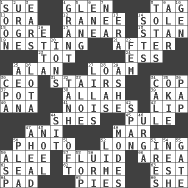 ACROSS 1. Institute legal proceedings 4. Small, secluded valley 8. Label 11. Mouth or opening 12. The wife of a rajah (variant) 14. Not divided or shared with others 15. Legendary monster 17. Approach 18. Comedian Laurel of Laurel & Hardy 19. Snuggling 21. Following 23. Small child 24. Curvy letter 25. ____ Jay Lerner 27. Rich soil 30. Corporate head (abbr.) 31. Flight of steps 34. Police officer (slang) 37. Cooking vessel 38. Assad's deity 39. Alias (abbr.) 40. Santa ___, CA 41. Annoying sounds 43. Mouth edge 44. "______ My Girl" (Turtles hit) 45. Whine 47. Cuckoo 49. Spoil 50. Picture 52. Yearning 56. Toward shelter 57. Watery 60. Type of rug 61. Lick closed 62. Singer Mel 63. Eastern Standard Time (abbr.) 64. Groovy apt. 65. Sliced desserts 66. A female animal or person DOWN 1. Within a short period 2. Goad 3. Hearing organs 4. Monetary aid 5. Long (Scottish) 6. Compass dir. 7. Teachers' org. 8. Hauls 9. Having or resembling wings 10. Commissioned mil. rank 13. Period 14. Fast planes 16. Singer James 20. Charged particles 22. Opposite of masc. 25. A really long time 26. Globular water bottle used in Asia 27. Ms. Damita and namesakes 28. Mouths or openings 29. American tennis player Robert 30. Accounting whiz (abbr.) 32. Hyperbolic tangent 33. Medicinal plant 34. Give a ring to 35. Migrant worker of the '30s 36. Infant food 42. Connect, as a bridge 44. Be seated 46. Capital and largest city of Mongolia 47. Forward in time 48. Christmas carol 49. Methods 50. Entreaty 51. Often (poetically) 52. Citrus frut 53. Angers 54. Tender 55. Yard entry 56. Viper 58. Trim (branches) 59. RI univ.