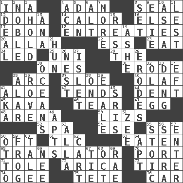 ACROSS 1. _ tizzy (2 wds.) 4. First of billions? 8. Lick closed 12. Capital of the state of Qatar 14. Bodily heat indicating an inflammation 16. Otherwise 17. Inky black, to poets 18. Pleas 20. Assad's deity 22. Double-curved letter 23. Consume 24. Directed 25. University (slang) 28. Definite Article 30. Washington bills 31. Wear away 35. Curve 37. A type of plum 40. Norwegian king 41. Medicinal plant 42. Looks after 44. Gouge 45. Polynesian shrub of the pepper family 46. Rend 47. Oval reproductive body of a fowl 48. Sports stadium 50. Belonging to Elizabeth 52. Health resort 54. Compass dir. 55. Compass dir. 58. Often (poetically) 61. Affectionate concern, for short 63. Ingested 65. Interpreter 70. Left side of a ship or aircraft 71. Lacquered or enameled metalware 72. N. Chile seaport 73. Become fatigued 74. Double curve, resembling the letter S 75. False hair 76. Auto DOWN 1. Perfect 2. Having high moral qualities 3. Hold, grip (Informal) 4. Adept person 5. One of the 12 tribes of Israel 6. Keyboard modifier key 7. Greater amount 8. Put into a specified state 9. Writer Wiesel 10. At sea 11. For fear that 13. Santa ___, CA 15. Relief 19. American tennis player Robert 21. Attila the _ 26. Egg locale 27. Small island 29. Eats (away) 30. Seas 32. Cassini of fashion 33. Mild oath, euphamism for damn 34. Bank Draft (abbr.) 35. Having or resembling wings 36. Be footloose 38. Single 39. Peak District village in England 41. Alias (abbr.) 43. Indian titles of respect 49. Tenement units (abbr.) 51. Last letter of the English alphabet 53. Silent film actress Nazimova 55. Unemotional 56. Father Junipero _ 57. Keyboard key 58. "Beetle Bailey" pooch 59. Toadlike animal 60. Story 62. Draw slowly or heavily 64. Fitting 66. Born 67. Neckwear 68. Sep. follower 69. Actress Charlotte