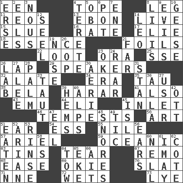 ACROSS 1. Car or cant ending 4. Drink excessively 8. Part of a journey 11. Vintage cars 13. Inky black, to poets 14. Not recorded 15. Turn sharply 16. Assign a rank or rating to 17. Writer Wiesel 18. Core 21. Fencing necessities 22. Plunder 23. Mouth or opening 25. Compass dir. 26. Pet locale 29. Orators 32. Having winglike extensions 34. Epoch 35. The 19th letter of the Greek alphabet 38. Actor Lugosi 39. Ethiopian city, capital of Harari 41. In addition 43. Australian flightless bird 44. Connecticut Ivy Leaguer 45. An arm off of a larger body of water 46. Storms 50. Nonscientific branch of learning 51. Ewer handle 54. Curvy letter 55. "Death on the ____" 57. Satellite of Uranus 59. Pertaining to the sea 63. Airtight sealed metal containers 64. Pull apart 67. San ____ (Riviera town) 68. Comfort 69. Migrant worker of the '30s 70. Narrow board 71. Compass dir. 72. Soaks 73. Sodium hydroxide DOWN 1. Celtic language 2. Snakelike fish 3. Common sense 4. Cigar-shaped 5. Chief or king in Benin or Nigeria 6. Cooking vessel 7. Compass dir. 8. Ms. Damita and namesakes 9. Vices 10. Honkers 12. Stitch closed the eyes of (a falcon) 14. Lion 19. Characteristic smell of wine 20. Police officer (slang) 21. At a great distance 23. Gumbo ingredient 24. Stern 26. Experiment locale 27. Toward shelter 28. Inside of hand 30. Nest on high 31. Comedian Laurel of Laurel & Hardy 33. Tense 36. Silent film actress Nazimova 37. One who uses or employs something 39. Equivocates 40. High mountains 42. Baseball player Mel 45. Capri or Wight 47. Snakelike fish 48. Sounds asleep 49. Nervous spasm 51. Ingested 52. Believer in; advocate of (suffix) 53. Wash lightly 56. Hearing organs 58. Compass dir. 60. 1994 drama film starring Jodie Foster 61. "If ____ say so..." 62. ____ d'Azur (French Riviera) 64. Pull behind 65. Make supply last 66. Small island