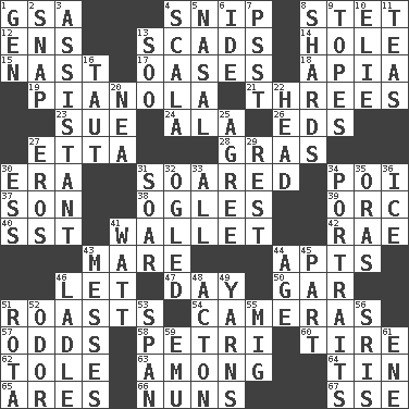 ACROSS 1. Girls' org. (abbr.) 4. Sever or remove by pinching or nipping 8. Proofreading order 12. Followers of ems 13. Heaps 14. Opening into or through something 15. Political cartoonist Thomas 17. Fertile tracts in a desert 18. Capital of Western Samoa 19. Player piano 21. Triads 23. Take to court 24. In the manner of 26. Begley and Asner 27. Singer James 28. Pate de foie ____ 30. Epoch 31. Flew 34. Luau course 37. Male child 38. Stares at amorously 39. The grampus (Milton) 40. Fast jet (abbr.) 41. Place for singles 42. Actress Charlotte 43. Female horse 44. Flats, for short 46. Allow 47. 24 hours 50. Slender fish 51. Ridicules or criticizes harshly 54. Devices for capturing images 57. Probability 58. _ dish (used to culture cells) 60. Become fatigued 62. Lacquered or enameled metalware 63. Amid 64. Metal container 65. Ancient Greek god of war 66. Religious women 67. Compass dir. DOWN 1. Commissioned military rank (abbr.) 2. Fastener 3. Helper 4. Any of the three canals of the cochlea 5. Relating to the nose 6. Binary compound 7. Inconspicuous attention getter 8. Broken pieces 9. Drinks excessively 10. Writer Wiesel 11. Beverages made from leaves 13. "Barney Miller" actor Jack 16. Pulled tight 20. Teachers' org. 22. Froth on beer 25. Match 27. Greek god of love 29. Relief 30. Curvy letter 31. Fly high 32. Stared at amorously 33. Everything 34. Likenesses of persons 35. Mouths or openings 36. Frozen water 41. Electrical Unit 43. Makes clutter 44. Grow older 45. Component 46. Dipping utensil 48. Gambison 49. Tall tales 51. Roll call or roster of names 52. Aroma 53. Connect, as a bridge 55. Russian fighter aircraft 56. Indian titles of respect 59. Australian flightless bird 61. Compass dir.
