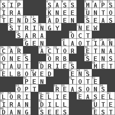 ACROSS 1. Small drink 4. Backtalk 8. Atlas contents 12. Lyricist Gershwin 13. Leg joint 14. To (old English) 15. Looks after 18. Arabian gulf 19. Oceans 20. Slender, wiry 22. ___ Haven, CT 23. "Two Mules for Sister ____" 24. Sep. follower 25. Commissioned military rank (abbr.) 26. Of or relating to Laos or its people 30. Auto 33. Thespian 36. Inactive volcano in Sicily 37. Singles 39. Globe 40. Elected reps. 41. Pulled tight 42. Frees from moisture 44. Was introduced to 45. Turned at an angle; bent 47. Followers of ems 50. Fenced enclosure 51. Lug 53. Choose 54. Thinks logically 57. Australian parrot (variant) 59. Writer Wiesel 61. Artist's stand 63. SW Asia republic 64. Deli pickle 65. Shoshoni 66. Mild oath, euphamism for damn 67. Observes 68. Eastern Standard Time (abbr.) DOWN 1. Be seated 2. Angers 3. Leg coverings 4. Heroin 5. "60 Minutes" Commentator Rooney 6. Perceive with the eye 7. Elected rep. 8. French bagpipes 9. Afresh 10. Parent Teacher Association (abbr.) 11. Mayday 16. To be drawn or hauled along 17. Father 21. Nanny 22. Non-commissioned officer (abbr.) 24. Boat paddle 26. Ear part 27. A distinct part 28. Singer Murray 29. Political cartoonist Thomas 30. ____ d'Azur (French Riviera) 31. Of or related to the anus 32. Reuben's nickname 34. Drawstring 35. Three (prefix) 38. Discontinuing 42. Lair 43. Bristle 46. Soggy 48. Sense of smell 49. Portico 52. Take place subsequently 53. NW Algerian seaport 54. Cause heat under the collar 55. Snakelike fish 56. Arranges properly for use 57. Hat (slang) 58. Mouth or opening 59. Begley and Asner 60. Whopper 62. Allow