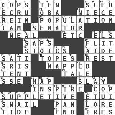 ACROSS 1. 911 reaches them 5. "___ Little Indians" 8. Downhill vehicle 12. Shade of tan 13. Chief or king in Benin or Nigeria 14. Sibling's daughter 15. It's straight from the horse's mouth 16. Census information 19. Scottish cap 20. Elected representative 21. Be tempered by heat 23. And so on (abbr.) 24. Raised railways 27. Plant excrements 30. Sudden quick movement 31. Unemotional ones 34. Assistant 35. Suttee (variant) 38. Drinks excessively 40. Respite 41. Indian titles of respect 42. Slept 44. Portable shelter 45. Falsehood 46. Compass dir. 47. Atlas unit 50. Kill 53. Stimulate to action 57. Police officer (slang) 59. Supplementary 63. Needle holder 64. Slow-paced one 65. Baking dish 66. Old wives' tales, e.g. 67. Periodic rise and fall of the sea level 68. Conclusion 69. Angers DOWN 1. Certainty 2. Sea 3. First class 4. Player for Phoenix 5. Drink excessively 6. Inky black, to poets 7. California wine valley 8. Be seated 9. Luau accessory 10. Environmental prefix 11. Lair 14. Drug cop 17. Shoshoni 18. Car dealer's back yard 20. Narrow board 22. Help 24. Writer Wiesel 25. Flaplike coverings 26. Proofreading order 28. Cooking vessel 29. The Jewish people; Israel 30. Bundle 32. Numbers guy (abbr.) 33. Back-to-school mo. 35. Fast planes 36. Ancient Greek god of war 37. Prong on a fork 39. Health resort 43. Otherwise 47. Place where flour is made 48. A saturated hydrocarbon 49. Pacific Standard Time (abbr.) 51. Thespian 52. You are 54. Corncob 55. "Terrible" tsar 56. Tear apart 58. Sliced desserts 59. Fast jet (abbr.) 60. Corn or form start 61. Groovy apt. 62. Sliced dessert 63. Biblical high priest