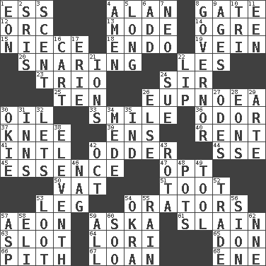 ACROSS 1. Curvy letter 4. ____ Jay Lerner 8. Yard entry 12. The grampus (Milton) 13. Method 14. Legendary monster 15. Sibling's daughter 18. Inside; within (prefix) 19. Distinctive style or manner 20. Catching in a trap 22. French article 23. Musical group of three 24. Title for a knight 25. "___ Little Indians" 26. Normal relaxed breathing 30. Petroleum 33. Grin 36. Scent 37. Leg joint 39. Followers of ems 40. Monthly bill 41. International (abbr.) 42. More peculiar 44. Compass dir. 45. Center 47. Choose 50. Large container 51. A blast of a horn 53. Part of a journey 54. Speakers 57. Period of immesurable duration 59. "____ silly question..." 61. Killed 63. Narrow, elongated depression 64. Australian parrot (variant) 65. Spanish title 66. Essential or central part 67. Grant temporary use of 68. Compass dir. DOWN 1. A really long time 2. Indian titles of respect 3. Aroma 4. So be it 5. Yearn 6. Say or write further 7. Modern: prefix 8. Head of state? 9. Matures 10. Three (prefix) 11. Car or cant ending 16. Haul 17. One of the Great Lakes 21. Charged particles 22. Mouth edge 24. Take to court 26. Otherwise 27. Lyric poems 28. Immeasurably long periods of time 29. Johnson of "Laugh-In" 30. Migrant worker of the '30s 31. Taverns 32. Allows 34. Ancient Persian 35. Indiana (abbr.) 38. Veterans Day date 42. Sep. follower 43. Round or rotation of duties 46. Tired old horse 48. Cooking vessels 49. Instrument 52. Buy and sell 53. Plunder 54. Gumbo ingredient 55. Water falling in drops from the sky 56. The Jewish people; Israel 57. Cleo's killer 58. Biblical high priest 59. Everything 60. "Barney Miller" actor Jack 62. Compass dir.