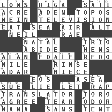 ACROSS 1. Coldest temperatures 5. Capital of Latvia 9. Suttee (variant) 13. Land measure 14. Arabian gulf 15. Traditional theme or motif 16. Count _ (2 wds.) 17. Household entertainment appliance 19. Ingest 20. Ocean 21. Wind 22. The first octave above the treble staff 23. Famous astronaut Armstrong 25. Actress Charlotte 26. Relating to or accompanying birth 30. Musical group of three 34. Stay 35. Coop moms 36. ____ Jay Lerner 39. Peak District village in England 42. Redecorate 43. Mediterranean tributary 44. Remove soap 46. The sixth month of the Jewish calendar 47. Sibling's daughter 48. Greek goddess of the dawn 51. At sea 54. Institute legal proceedings 57. Whopper 58. Allow 60. Reproach for some lapse or misdeed 62. Interpreter 65. "Corrida" creature 66. Match 67. Pull into pieces 68. Aroma 69. Nanny 70. Without 71. Portable shelter DOWN 1. Unable to walk 2. Sea 3. Compose 4. Elected rep. 5. Assign a rank or rating to 6. The content of cognition 7. Set 8. Approach 9. Mayday 10. Capital of Western Samoa 11. Implement 12. Is not 15. Hoop that covers a wheel 18. By way of 20. Broad, flat, thick piece 24. More empty; more void 27. Neckwear 28. Increase 29. Memorize 30. Trios 31. To riddle 32. Working for oneself (abbr.) 33. Bear (Spanish) 36. Santa ___, CA 37. Flaplike covering 38. In the manner of 40. Cards in a Roman deck? 41. Compass dir. 45. Scram, to a cat 48. Otherwise 49. Petroleum 50. Theater features 52. Eat (away) 53. Composer Copland 54. Comedian Laurel of Laurel & Hardy 55. Capital and largest city of Mongolia 56. Merit 58. Grant temporary use of 59. Blunders 61. Sweet dark-red dessert wine 63. Teachers' org. 64. Beverage made from leaves 65. Small child