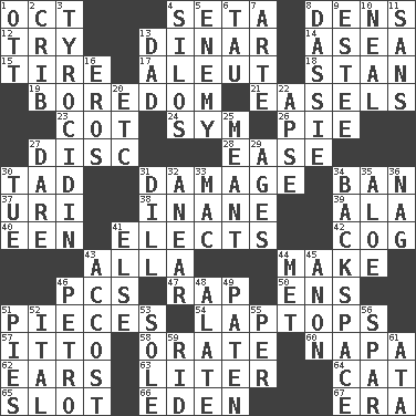 ACROSS 1. Sep. follower 4. Bristle 8. Lairs 12. Attempt to accomplish something 13. Middle Eastern gold or silver currency 14. Toward the sea 15. Become fatigued 17. Native American of Southwest Alaska 18. Comedian Laurel of Laurel & Hardy 19. Mood resulting from idleness 21. Artist's stands 23. Small bed 24. Symbol (abbr.) 26. Sliced dessert 27. Flat circle 28. Comfort 30. Bit 31. Break 34. Forbid 37. RI univ. 38. Lacking in sense or substance 39. According to 40. Car or cant ending 41. Opts 42. Gear tooth 43. Silent film actress Nazimova 44. Cause to be 46. Personal Computers (abbr.) 47. Hit sharply and swiftly 50. Followers of ems 51. Parts 54. Portable computers 57. "Tell ____ the Marines!" 58. Declaim 60. California wine valley 62. Hearing organs 63. 61 cubic inches 64. Domesticated feline 65. Position in a hierarchy or organization 66. Genesis locale 67. Epoch DOWN 1. Baseball player Mel 2. Baby bed with high sides 3. Polypeptide antibiotic 4. Grain storage towers 5. Foe 6. The 19th letter of the Greek alphabet 7. Johnson of "Laugh-In" 8. Small ungulate mammals of Africa 9. First name in cosmetics 10. Be tempered by heat 11. Without 13. June honoree 16. Greek god of love 20. And so on (abbr.) 22. Domed church section 25. Intended 27. Have the gumption 29. Matures 30. Third day of the wk. 31. Deli pickle 32. Approach 33. Big _ 34. Keyboard key 35. _ vera 36. Tired old horse 41. Otherwise 43. Buttonhole 44. Was introduced to 45. At once, immediately (arch.) 46. Stone: prefix 48. Having winglike extensions 49. Eucharist need 51. Sliced desserts 52. Slanted text style (abbr.) 53. Not divided or shared with others 55. For each 56. Coast Guard woman 59. To free from 61. "One Day ___ Time"