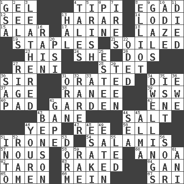 ACROSS 1. Set 4. Native american tent (variation) 8. Mild oath 12. Perceive with the eye 13. Ethiopian city, capital of Harari 14. Farming town in central California 15. Having or resembling wings 17. Place in a line 18. Goldbrick 19. Paper fasteners 21. Dirtied 23. Part of HMS, perhaps 24. A female animal or person 26. Two (Sp.) 27. Painter Guido (1575-1642) 28. Proofreading order 30. Title for a knight 31. Spoke pompously 34. Expire 37. Mature 38. The wife of a rajah (variant) 39. Compass dir. 40. Writing tablet 41. Place where plants grow 42. Compass dir. 43. Object of repulsion 44. Table seasoning 46. Slangy assent 47. To riddle 50. Pipe bend 51. Pressed 54. Deli grouping 57. Good sense 58. Declaim 60. Small Philippine buffalo 62. Pacific island yam 63. Moved through 64. Separate the seeds from cotton 65. Presage 66. Chow _ 67. Indian title of respect (Mr.) DOWN 1. Girls' org. (abbr.) 2. Snakelike fish 3. Tough but pliablecoriaceous 4. Stories 5. From or relating to Ireland 6. Baking dish 7. Angers 8. American author Paul (1891-1958) 9. Finish lines 10. Edge tool used to cut and shape wood 11. Passed on 13. Actor Linden 16. Water falling in drops from the sky 20. Air pressure measure (abbr.) 22. Wrote a lyric poem 25. First name in cosmetics 27. Capital of Latvia 29. Adolescent 30. Plant excrement 31. Northwest Algerian city 32. More uncommon 33. Also 34. Residences 35. Is not 36. She-sheep 41. Yawn 43. Gillaume's butler role 44. Ocean 45. _ mater 46. You are 48. 1973 Nobel Price Winner (Physics) Leo 49. Consumed 51. To the inside or interior of 52. Wander 53. Dormintory (informal) 55. Directed 56. Fly high 59. Actress Charlotte 61. Black tropical American cuckoo