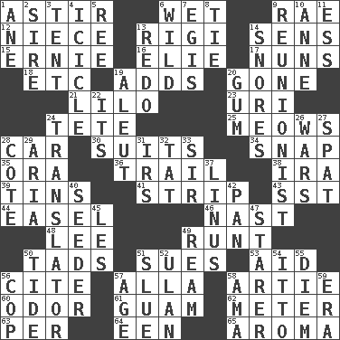 ACROSS 1. Having gotten out of bed 6. Dripping 9. Actress Charlotte 12. Sibling's daughter 13. Swiss mountan, "Queen of the Mountains" 14. Elected reps. 15. Bert's buddy 16. Writer Wiesel 17. Religious women 18. And so on (abbr.) 19. Sums up 20. Went 21. _ and Stitch 23. RI univ. 24. False hair 25. Catcalls? 28. Automobile 30. Sets or collections 34. Fastener 35. Mouth or opening 36. Go after with the intent to catch 38. Retirement account (abbr.) 39. Canisters 41. Empty completely 43. Fast jet (abbr.) 44. Artist's stand 46. Political cartoonist Thomas 48. Area sheltered from the wind 49. Undersized animal 50. Small boys 51. Takes to court 53. Assist 56. Quote 57. Silent film actress Nazimova 58. Nick name for Arthur 60. Aroma 61. Island territory of the United States 62. Distance measurement 63. For each 64. Car or cant ending 65. Scent DOWN 1. A saturated hydrocarbon 2. Beget 3. Portable shelter 4. Hanging ice 5. To separate or throw off 6. Rampant 7. The front part of a cuirass 8. Standoff 9. One who advocates reunion 10. Queen of England 1702-14 11. Curvy letter 13. Make new 14. Sounds asleep 19. Native American of Southwest Alaska 20. Chewing product 22. It is 24. Interpreter 26. Armed conflicts 27. Petty quarrel 28. ____ d'Azur (French Riviera) 29. Roberta Peters solo 31. Big collection agency 32. Make lace 33. Title for a knight 37. "_ and Lucy" (Charlie Brown theme song) 40. Sowing specialist 42. Baking dish 45. French article 47. A viewer who gazes fixedly 49. 480, 500 or 516 sheets of paper 50. Periodic rise and fall of the sea level 51. Change direction abruptly 52. Uhlan (variant) 54. "Tell ____ the Marines!" 55. South Vietnam president (1954) 56. Police officer (slang) 57. Grow older 58. Nanny (var.) 59. Period