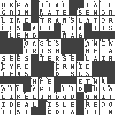 ACROSS 1. Gumbo ingredient 5. Slanted text style (abbr.) 9. Story 13. Amused look 14. Nathan's nickname 15. Sir (Sp.) 16. Actor's bit 17. Interpreter 19. Raised railways 20. Keyboard modifier key 21. Call ___ day 22. ___ a Wonderful Life 23. Grant temporary use of 25. Tired old horse 26. Fertile tracts in a desert 30. Afresh 34. From or relating to Ireland 35. Actor Lugosi 36. Observes 39. Laconic 42. Den 43. Jane of fiction 44. Bert's buddy 46. Beverages made from leaves 47. Flat circles 48. Madame (abbr.) 51. Inactive volcano in Sicily 54. Had dinner 57. Tate display 58. Flaplike covering 60. Chief or king in Benin or Nigeria 62. Probability 65. A single undivided whole 66. Standard of perfection 67. Small island 68. Make new 69. Trial 70. Root beer relative 71. Detail DOWN 1. Stare at amorously 2. Shrimp-like planktonic crustaceans 3. Wash lightly 4. One (Scot) 5. International (abbr.) 6. Small pie 7. "One Day ___ Time" 8. Soviet premier 1918-24 9. Afternoon social gathering 10. Opposed to 11. Spoils 12. Blunders 15. Volcanic refuse 18. R.R. building 20. The sixth month of the Jewish calendar 24. Annoying sounds 27. Be seated 28. Compass dir. 29. Fragment 30. Most capable 31. Teachers' org. 32. Connecticut Ivy Leaguer 33. Armed conflict 36. Arrange properly for use 37. Sight organ 38. Epoch 40. _ Lanka 41. Followers of ems 45. On the rocks 48. Promenade 49. Medical imaging device (abbr.) 50. Moral principle 52. Music written for nine 53. Remain 54. Came down and settled, as after flight 55. Periodic rise and fall of the sea level 56. Supplements with great effort 58. Hang loosely or laxly 59. It may be bright or harebrained 61. Tiny particle 63. Erode 64. Bear (Spanish) 65. RI univ.