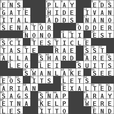 ACROSS 1. Followers of ems 4. Shaw product 8. Begley and Asner 11. Yard entry 13. Flintstone garb 14. "Terrible" tsar 15. Slanted text style (abbr.) 16. Does sums 17. Billionth: prefix 18. Elected representative 21. More peculiar 22. Words to Nanette 23. Cards in a Roman deck? 25. Eastern Standard Time (abbr.) 26. _-fi 29. A testis 32. Clothes sense 34. Actress Charlotte 35. Fast jet (abbr.) 38. Silent film actress Nazimova 39. Pottery fragment 41. Ancient Greek god of war 43. Part of a journey 44. Luau accessory 45. Sets or collections 46. Tchaikovsky ballet 50. Observe 51. Greek goddess of the dawn 54. ___ a Wonderful Life 55. Allows 57. Believer in; advocate of (suffix) 59. Honored 63. Sinks 64. Fastener 67. Like ___ of sunshine 68. Inactive volcano in Sicily 69. Seaweed 70. We are 71. French article 72. "Tell ____ the Marines!" 73. Conclude DOWN 1. The front part of a cuirass 2. Nathan's nickname 3. Comedian Laurel of Laurel & Hardy 4. N Egypt peninsula 5. Flaplike covering 6. Increase 7. It is so 8. Elude 9. Natives or inhabitants of Denmark 10. Derisive sound 12. Style 14. Indiana (abbr.) 19. Haul 20. Single 21. Lubricate 23. One who doesn't tell the truth 24. On the rocks 26. R.R. building 27. Give a ring to 28. Capri or Wight 30. Get behind 31. Son of Isaac 33. Labels 36. Indian titles of respect 37. False hair 39. Narrow board 40. Coop moms 42. Compass dir. 45. Stalk of a moss capsule 47. Victory 48. City in Syria 49. A weed 51. Artist's stand 52. Speak pompously 53. Signals 56. Cole _ (cabbage dish) 58. White ___ sheet 60. Relationship diagram 61. Merit 62. Colored 64. What Jean-Claude Killy likes to do 65. Fish or hair follower 66. Keyboard modifier key