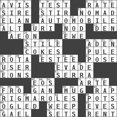 ACROSS 1. Deliberation 5. Trial 9. Assign a rank or rating to 13. Beget 14. Use a spoon 15. Roamer 16. Liveliness 17. Car 19. Keyboard modifier key 20. RI univ. 21. Allow head to fall sleepily 22. Lair 23. Period of immesurable duration 25. She-sheep 26. Vertical member of a panel or frame 30. An important port of Yemen 34. Popular sodas 35. Whine 36. Round or rotation of duties 39. First name in cosmetics 42. Airs 43. One who uses or employs something 44. Dodge 46. Immeasurably long periods of time 47. Spanish missionary in California 48. Greek goddess of the dawn 51. Johnson of "Laugh-In" 54. Back 57. Separate the seeds from cotton 58. Java container 60. Strike 62. Complicated, petty procedures 65. Cooking vessels 66. Stared at amorously 67. Shed a tear 68. Nights before holidays 69. Highlander 70. Puts into a specified state 71. Monthly bill DOWN 1. At sea 2. Country estate 3. Feeling or showing extreme anger 4. Elected rep. 5. Russian ruler of old 6. Needle holder 7. Be seated 8. Marketplace scale 9. Director Reiner 10. Among 11. Falsehood 12. Locale of original sin 15. Connecting point 18. Cut the grass 20. To (old English) 24. Motion picture awards 27. Mamie's husband 28. French article 29. _____ Park, CO 30. Become visible 31. Superhero pair 32. Raised railways 33. Born 36. Sorrow 37. Bear (Spanish) 38. "___ Little Indians" 40. First lady 41. Hearing organ 45. To trail on the ground 48. Mild oath 49. Boat paddle 50. Frozen precipitation (plural) 52. Collection of objects 53. Ingested 54. Toadlike animal 55. Port city in Latvia 56. Stare 58. Confront 59. United States Postal Service (abbr.) 61. Inconspicuous attention getter 63. Cartoonist voice _ Blanc 64. Area sheltered from the wind 65. For each