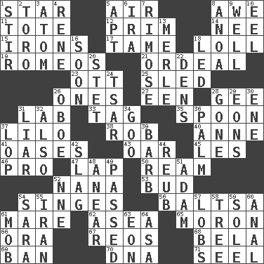 ACROSS 1. Play the lead 5. Atmosphere 8. Deep reverence 11. Haul 12. Demure 14. Born 15. Metal shackles 17. Docile 18. Hang loosely or laxly 19. Lover boys 21. Severe or trying experience 23. Baseball player Mel 25. Downhill vehicle 26. Washington bills 27. Car or cant ending 28. Turn to the right 31. Experiment locale 33. Label 35. Soup utensil 37. _ and Stitch 38. Director Reiner 40. Singer Murray 41. Fertile tracts in a desert 43. Rowing implement 45. French article 46. Adept person 47. Infant locale 50. 480, 500 or 516 sheets of paper 52. Nanny 53. Partially opened flower 54. Burns superficially 56. Greek mezzo-soprano Agnes 61. Female horse 62. Toward the sea 65. Person of subnormal intelligence 66. Mouth or opening 67. Vintage cars 68. Actor Lugosi 69. Bar 70. Heredity factor (abbr.) 71. Sew up the eyelids of hawks and falcons DOWN 1. Disorderly outburst 2. "Corrida" creature 3. Tiny particle 4. French philosopher Descartes 5. Fitting 6. Retirement account (abbr.) 7. Full of chinks, cracks, or crevices 8. Small Philippine buffalo 9. Not ill 10. Snakelike fish 13. Haggard of country music 16. Within a short period 18. Directed 20. Proofreading order 22. Cub Scout units 24. Russian ruler of old 26. Mitch Miller's instrument 28. Went 29. Immeasurably long periods of time 30. Compass dir. 31. One who doesn't tell the truth 32. In addition 34. Thick or sticky substance 36. Inside of hand 37. Chop off 39. Sharp remark 42. Volcanic refuse 44. Reuben's nickname 48. Approach 49. Went by 51. First of billions? 52. Compass dir. 54. "Two Mules for Sister ____" 55. SW Asia republic 57. Tennis shots 58. Woody plant 59. Not divided or shared with others 60. Of or related to the anus 61. Disorderly crowd 63. Period of immesurable duration 64. White ___ sheet