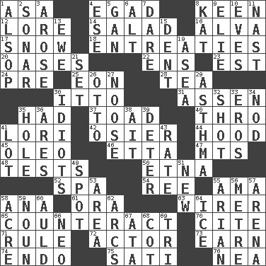 ACROSS 1. White ___ sheet 4. Mild oath 8. Peachy ____! 12. Old wives' tales, e.g. 14. First course 16. Inventor's middle name 17. Overwhelm 18. Pleas 20. Fertile tracts in a desert 22. Followers of ems 23. Eastern Standard Time (abbr.) 24. Before (prefix) 25. A really long time 28. Beverage made from leaves 30. "Tell ____ the Marines!" 31. NE Netherlands city 35. Possessed 37. Frog relative 40. Through, poetically 41. Australian parrot (variant) 42. Flexible twig of a willow tree 44. Parka part 45. Margarine 46. Singer James 47. Mountains (abbr.) 48. Trials 50. Inactive volcano in Sicily 52. Health resort 54. To separate or throw off 55. Nanny (var.) 58. Santa ___, CA 61. Mouth or opening 63. One who wires 65. Frustrate 70. Quote 71. General guideline 72. Thespian 73. Merit 74. Inside; within (prefix) 75. Suttee (variant) 76. Teachers' org. DOWN 1. Columnist Joseph or Stewart 2. Underwater navigation system 3. Came up 4. Compass dir. 5. Separate the seeds from cotton 6. The first octave above the treble staff 7. Have the gumption 8. Krazy ___ of comics 9. Writer Wiesel 10. Nights before holidays 11. Political cartoonist Thomas 13. She-sheep 15. Undesirable depression on a surface 19. At sea 21. Arrange properly for use 26. "Beetle Bailey" pooch 27. Trap for birds or small mammals 29. Respiratory problem 30. Foolish or stupid persons 32. Opportunity 33. Greek god of love 34. Lower and raise head in agreement 35. Opening into or through something 36. Ancient Greek god of war 38. Small island 39. Prevent from occurring 41. Car dealer's back yard 43. Assign a rank or rating to 49. Blemish 51. ___ Haven, CT 53. Length times width 55. Believer in; advocate of (suffix) 56. Distance measurement (Brit.) 57. Sports stadium 58. 43,560 square feet 59. Part of speech 60. Old (Scot.) 62. Curves 64. Frozen water 66. Modern: prefix 67. "One Day ___ Time" 68. Small bed 69. Three (prefix)