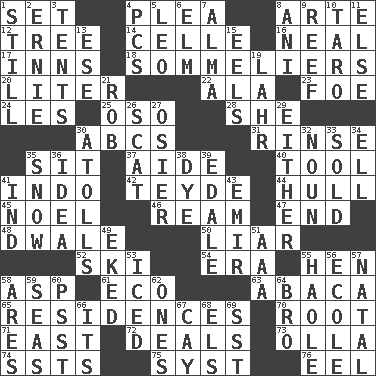 ACROSS 1. Put into a specified state 4. Entreaty 8. Johnson of "Laugh-In" 12. Relationship diagram 14. Cell (Danish) 16. Actress Patricia 17. Lodging establishments 18. Wine waiters 20. 61 cubic inches 22. Insect wing 23. Enemy 24. French article 25. Bear (Spanish) 28. A female animal or person 30. Lettered men learn these first 31. Remove soap 35. Be seated 37. Assistant 40. Implement 41. _ china 42. Miss Universe 1986, Barbara Palacios _ 44. Frame or body of a ship 45. Christmas carol 46. 480, 500 or 516 sheets of paper 47. Conclude 48. A sleeping potion; an opiate (poet.) 50. One who doesn't tell the truth 52. What Jean-Claude Killy likes to do 54. Period 55. Layer 58. Viper 61. Environmental prefix 63. Phillipine bananalike plant 65. Dwellings 70. Carrot, for example 71. Compass direction 72. Allots cards 73. Water jar 74. Fast planes 75. System (abbr.) 76. Snakelike fish DOWN 1. Not moving 2. Bert's buddy 3. Portable shelters 4. Personal Computers (abbr.) 5. Lion 6. Shade tree 7. _ mater 8. Black tropical American cuckoo 9. Coral collection 10. Edible starchy tuberous root 11. Otherwise 13. Compass dir. 15. Snakelike fish 19. Cowardly lion portrayer 21. Director Reiner 26. Go away! 27. Flexible twig of a willow tree 29. One or the other of two 30. Ringlike coral islands and reefs 32. Part of speech 33. Exchanged or delivered for money 34. Pipe bend 35. Overwhelm 36. It may be bright or harebrained 38. Color 39. Peak District village in England 41. Indiana (abbr.) 43. Arab leader 49. Made supply last 51. Auto club (abbr.) 53. On the rocks 55. White Person, in Hawaii 56. Learning spot: Fr. 57. Relating to or accompanying birth 58. Ancient Greek god of war 59. Oceans 60. Inconspicuous attention getter 62. Washington bills 64. Sis' sibling 66. ___ a Wonderful Life 67. Island 68. Raised railways 69. Fast jet (abbr.)