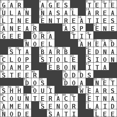 ACROSS 1. Slender fish 4. Grows older 8. Wig 12. Uhlan (variant) 14. Rhinal 16. Type of rug 17. Actor's bit 18. Pleas 20. Approach 22. Cleo's killer 23. Compass dir. 24. Unit of force equal to gravity 25. Mouth or opening 28. Teat (slang) 30. Christmas carol 31. Forward in time 35. R.R. building 37. Sharp remark 40. Pulitzer Prize-winning author Ferber 41. Hoof sound 42. Took without asking 44. The Jewish people; Israel 45. Moist 46. Inky black, to poets 47. Call ___ day 48. Guide 50. Likelihood 52. Two (Sp.) 54. ___ good deed 55. Remaining after all deductions 58. Quiet! 61. Fr. "Yes" 63. Erodes 65. Frustrate 70. Inactive volcano in Sicily 71. So be it 72. Sir (Sp.) 73. Put down 74. Thickened enlargement 75. Suttee (variant) 76. Area sheltered from the wind DOWN 1. Russian prison camp 2. Place in a line 3. Indian princess (variant) 4. A saturated hydrocarbon 5. Separate the seeds from cotton 6. Eastern Standard Time (abbr.) 7. "Two Mules for Sister ____" 8. Make lace 9. 4th largest of the Great Lakes 10. Adolescent 11. Comfort 13. Teachers' org. 15. For fear that 19. Capital of Western Samoa 21. Friend of Pooh 26. Confederate soldiers (slang) 27. Having winglike extensions 29. College paper 30. Slept 32. Prepare for publication 33. Small Philippine buffalo 34. Daniel's nick name 35. Narrow board 36. Heavy book 38. Director Reiner 39. Vital fluid 41. Music discs 43. Inside; within (prefix) 49. Carrot, for example 51. Fool 53. Takes to court 55. Relating to or accompanying birth 56. Bert's buddy 57. Sadhe (variant) 58. Skim 59. Like (prefix) 60. Took on color 62. Angers 64. Snakelike fish 66. Compass dir. 67. Santa ___, CA 68. Small bed 69. Three (prefix)