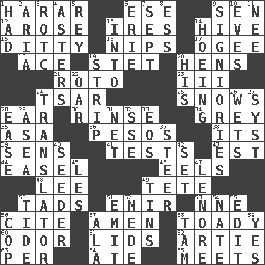 ACROSS 1. Ethiopian city, capital of Harari 6. Compass dir. 9. Elected rep. 12. Came up 13. Angers 14. Hub of activity 15. Simple song 16. Cuts off 17. Double curve, resembling the letter S 18. Adept person 19. Proofreading order 20. Coop moms 21. Printing process, for short 23. One more than two 24. Russian ruler of old 25. Frozen precipitation (plural) 28. Hearing organ 30. Wash lightly 34. Jennifer or Joel 35. White ___ sheet 36. Mexican monetary units 38. It is 39. Elected reps. 41. Trials 43. Eastern Standard Time (abbr.) 44. Artist's stand 46. Snakelike fish 48. Area sheltered from the wind 49. False hair 50. Bits 51. Arab leader 53. Compass dir. 56. Quote 57. So be it 58. Sycophant 60. Scent 61. Flaplike coverings 62. Nick name for Arthur 63. For each 64. Had dinner 65. Confronts DOWN 1. Possessed 2. Roberta Peters solo 3. College mil. group 4. Michaelmas daisies 5. Marina Del _, California 6. 4th largest of the Great Lakes 7. Back-to-school mo. 8. Curvy letter 9. Seigniories (variant) 10. Nights before holidays 11. Born 13. To the inside or interior of 14. Weeding 19. Remove all contents or possession from 20. Part of HMS, perhaps 22. Boat paddle 24. Interpreter 26. Moistens 27. System (abbr.) 28. Relaxation 29. At sea 31. Remaining after all deductions 32. Compass dir. 33. Greek goddess of the dawn 37. Bull 40. Sowing specialist 42. Arrange properly for use 45. French article 47. Poe poem 49. Airtight sealed metal containers 50. Periodic rise and fall of the sea level 51. Send forth 52. Ancient Persian 54. Nathan's nickname 55. Prepare for publication 56. Police officer (slang) 57. Chicken ___ king 58. Scottish cap 59. Consenting reply