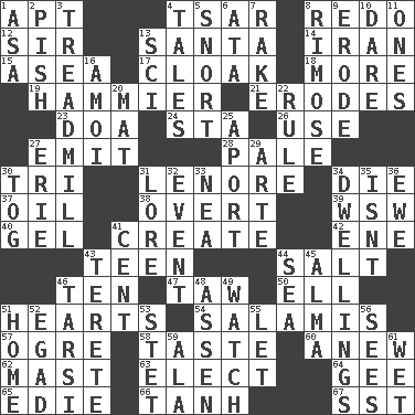 ACROSS 1. Fitting 4. Russian ruler of old 8. Redecorate 12. Title for a knight 13. Before Barbara or Clara 14. SW Asia republic 15. At sea 17. Loose outer garment 18. Greater amount 19. More overdramatic by comparison 21. Eats (away) 23. ___ good deed 24. R.R. building 26. Purpose 27. Send forth 28. Diluted with white 30. Three (prefix) 31. Poe poem 34. Pass on 37. Petroleum 38. Unconcealed 39. Compass dir. 40. Set 41. Cause to be 42. Compass dir. 43. Adolescent 44. Table seasoning 46. "___ Little Indians" 47. The 23rd letter of the Hebrew alphabet 50. Pipe bend 51. Centers of feelings and intuitions 54. Deli grouping 57. Legendary monster 58. Clothes sense 60. Afresh 62. Vertical spar for supporting sails 63. Voters do this 64. Unit of force equal to gravity 65. Singer Brickell 66. Hyperbolic tangent 67. Fast jet (abbr.) DOWN 1. White ___ sheet 2. Expression of disdain 3. Excercise machine 4. Stories 5. Derisive sound 6. "One Day ___ Time" 7. Immoral or dissolute person 8. Full of chinks, cracks, or crevices 9. Eat (away) 10. Have the gumption 11. Washington bills 13. _-fi 16. Mine, in Marseilles 20. Floor covering 22. Court order 25. To the left, to Queeg 27. One of the Great Lakes 29. Johnson of "Laugh-In" 30. Coat; cloak 31. Old wives' tales, e.g. 32. Happening 33. Teachers' org. 34. Homes 35. Is not 36. She-sheep 41. Penny 43. Cylindrical with tapered ends 44. Ocean 45. _ mater 46. Tarsus (plural) 48. NE Netherlands city 49. Observe 51. Dwelling 52. Mild oath 53. Proofreading order 55. Allow 56. Observes 59. Insect wing 61. Soggy
