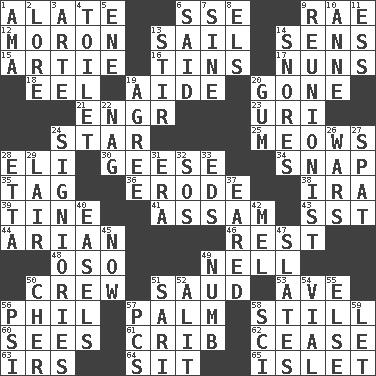 ACROSS 1. Having winglike extensions 6. Compass dir. 9. Actress Charlotte 12. Person of subnormal intelligence 13. Move on water 14. Elected reps. 15. Nick name for Arthur 16. Metal containers 17. Religious women 18. Snakelike fish 19. Assistant 20. Went 21. Engineer (abbr.) 23. RI univ. 24. Play the lead 25. Catcalls? 28. Biblical high priest 30. Honkers 34. Fastener 35. Label 36. Eat (away) 38. Retirement account (abbr.) 39. Prong on a fork 41. Indian state 43. Fast jet (abbr.) 44. Believer in; advocate of (suffix) 46. Relief 48. Bear (Spanish) 49. 1994 drama film starring Jodie Foster 50. Ship's personnel 51. Saudi Arabian king (1953-1964) 53. "___ Maria" 56. Silvers or Donahue 57. Inside of hand 58. Free from disturbance or agitation 60. Perceives with the eye 61. Baby bed with high sides 62. Desist 63. Big collection agency 64. Be seated 65. Small island DOWN 1. Nursemaid (var.) 2. Old wives' tales, e.g. 3. Johnson of "Laugh-In" 4. Bathroom 5. Compass dir. 6. Expressed in words 7. Trig term 8. Raised railways 9. One who advocates reunion 10. Queen of England 1702-14 11. Curvy letter 13. Agitate 14. Sounds asleep 19. Match 20. Chewing product 22. Tired old horse 24. Seigniories (variant) 26. Armed conflicts 27. Argument over a trivial matter 28. Singer James 29. Den 31. Period 32. Mayday 33. Begley and Asner 37. Having ears or earlike features 40. Artist's stands 42. Cartoonist voice _ Blanc 45. At this time 47. Chalkboards 49. Unfeeling 50. "Mermaids" star 51. Indian skirt 52. Came down and settled, as after flight 54. Small bottle 55. Otherwise 56. 23rd letter of the Greek alphabet 57. Personal Computers (abbr.) 58. _-fi 59. Allow