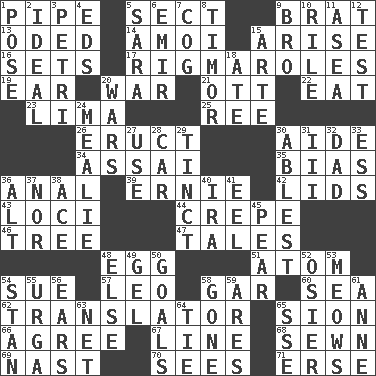 ACROSS 1. Corncob 5. Religious group 9. Naughty child 13. Wrote a lyric poem 14. Mine, in Marseilles 15. Get up 16. Puts into a specified state 17. Complicated, petty procedures 19. Ewer handle 20. Armed conflict 21. Baseball player Mel 22. Ingest 23. Pale green bean 25. Portuguese money of account (variant) 26. Spew [out] 30. Helper 34. Slender Brazilian palm 35. Prejudice 36. Of or related to the anus 39. Bert's buddy 42. Flaplike coverings 43. Locales 44. Streamer paper 46. Relationship diagram 47. Stories 48. Oval reproductive body of a fowl 51. Smallest unit of an element 54. Take to court 57. Lion 58. Slender fish 60. Ocean 62. Interpreter 65. The Jewish people; Israel 66. Match 67. Actor's bit 68. Stitched 69. Political cartoonist Thomas 70. Perceives with the eye 71. Celtic language DOWN 1. Introduce or present, as a question 2. Standard of perfection 3. _ dish (used to culture cells) 4. Begley and Asner 5. "Two Mules for Sister ____" 6. Independent ruler or chieftain 7. Gear tooth 8. The easternmost of the Lesser Sundas 9. Sis' sibling 10. Cause heat under the collar 11. At sea 12. Trial 15. Johnson of "Laugh-In" 18. Had dinner 20. Armed conflicts 24. Ear of corn 27. Purpose 28. Auto 29. Colored lightly or faintly 30. Most capable 31. One more than two 32. June honoree 33. Double-curved letter 36. The first octave above the treble staff 37. Not either 38. Adept person 40. Retirement account (abbr.) 41. Snakelike fish 45. Lightbulb-shaped fruit 48. Otherwise 49. Set 50. Finish lines 52. Flexible twig of a willow tree 53. Catcalls? 54. Comedian Laurel of Laurel & Hardy 55. Capital and largest city of Mongolia 56. Hearing organs 58. Went 59. Ancient Greek god of war 61. Queen of England 1702-14 63. Fish or hair follower 64. Standoff 65. Compass dir.