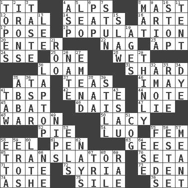 ACROSS 1. Teat (slang) 4. High mountains 8. Vertical spar for supporting sails 12. Taken by mouth 14. Theater features 16. Johnson of "Laugh-In" 17. Airs 18. Census information 20. Keyboard key 22. Tired old horse 23. Fitting 24. Compass dir. 25. Single 28. Dripping 30. Rich soil 31. Pottery fragment 35. _ moment's notice (2 wds.) 37. Beverages made from leaves 40. "If ____ say so..." 41. Cook's measure (abbr.) 42. Related on the mother's side 44. Short letter 45. Blind as ____ 46. Raised platform 47. Untruth 48. Make _____ (do battle with) 50. Made of lace 52. Sliced dessert 54. Nilotic language 55. Opposite of masc. 58. Snakelike fish 61. Animal enclosure 63. Honkers 65. Interpreter 70. Stalk of a moss capsule 71. Carry 72. Damascus' land 73. Genesis locale 74. American tennis player Robert 75. Filth; sediment 76. Put into a specified state DOWN 1. Drinks excessively 2. Metal shackles 3. Clothes sense 4. Cleo's killer 5. Lion 6. Infant food 7. Make senseless or dizzy 8. Floor covering 9. Operatic vocal solo 10. Close up, plug up 11. Portable shelter 13. Area sheltered from the wind 15. Cole _ (cabbage dish) 19. Eras 21. Friend of Pooh 26. Nathan's nickname 27. Make improvements or corrections to 29. Without force or sincere effort 30. Portable computer 32. Mine, in Marseilles 33. Assign a rank or rating to 34. Color 35. Swedish rock group 36. Russian ruler of old 38. American Automobile Association (abbr.) 39. Free of sound 41. The 23rd letter of the Hebrew alphabet 43. Son of Isaac 49. Pinches, bites 51. Gear tooth 53. Snakelike fish 55. Eats 56. First name in cosmetics 57. Intended 58. Singer James 59. Greek god of love 60. Thin strip of wood or metal 62. Negative votes 64. Compass dir. 66. Born 67. Three (prefix) 68. Petroleum 69. Actress Charlotte