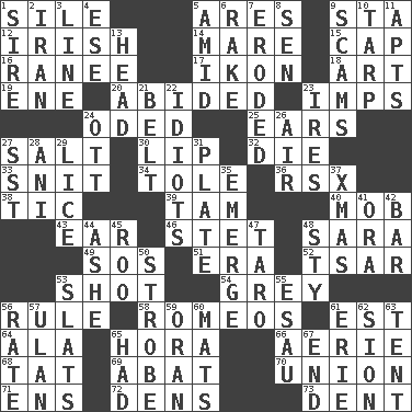 ACROSS 1. Drop; flow; fall 5. Ancient Greek god of war 9. R.R. building 12. From or relating to Ireland 14. Female horse 15. Head covering 16. The wife of a rajah (variant) 17. Visual representation of an object 18. Tate display 19. Compass dir. 20. Tolerated 23. Naughty children 24. Wrote a lyric poem 25. Hearing organs 27. Table seasoning 30. Mouth edge 32. Expire 33. In a ____ (agitated or irritated) 34. Lacquered or enameled metalware 36. Acura sports coupe 38. Nervous spasm 39. Scottish cap 40. Disorderly crowd 43. Hearing organ 46. Proofreading order 48. "Two Mules for Sister ____" 49. Distress signal 51. Epoch 52. Russian ruler of old 53. Attempt 54. Jennifer or Joel 56. General guideline 58. Lover boys 61. Eastern Standard Time (abbr.) 64. Insect wing 65. Israeli folk dance 66. Nest on high 68. Make lace 69. Blind as ____ 70. The state of being joined or united 71. Followers of ems 72. Lairs 73. Gouge DOWN 1. The founder of a family 2. SW Asia republic 3. Actor's bit 4. Compass dir. 5. Among 6. Libertine 7. Eaten away 8. Elected rep. 9. Fraudulent business schemes 10. Canvas cover 11. Tenement units (abbr.) 13. Froth on beer 21. Waist strap 22. Foolish or stupid persons 23. Angers 24. Baseball player Mel 26. Atmosphere 27. Fast jet (abbr.) 28. Cuckoo 29. Louse (plural) 31. Food holder 35. Develop 37. Dec. holiday 41. Mouth or opening 42. Oblong piece of solid material 44. American tennis player Robert 45. Friend of Pooh 47. Pacific island yam 48. Filthy place 50. Disco prop 53. Narrow boards 55. Son of Isaac 56. Assign a rank or rating to 57. ____ Bator, Mongolia 59. Northwest Algerian city 60. Floor coverings 61. 4th largest of the Great Lakes 62. The Jewish people; Israel 63. Portable shelter 65. Possessed 67. Conclude