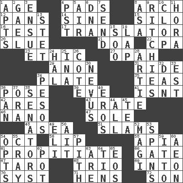 ACROSS 1. Grow older 4. Groovy apts. 8. Bowlike part 12. Baking dishes 14. Trig term 15. Grain storage tower 16. Trial 17. Interpreter 20. Change direction abruptly 21. ___ good deed 22. Numbers guy (abbr.) 23. Value system 27. Brightly colored fish 29. Soon (poet.) 31. Travel on an animal 34. Food holder 35. Beverages made from leaves 36. Airs 39. Night before a holiday 41. Is not 42. Ancient Greek god of war 43. A salt of uric acid 46. Billionth: prefix 47. Not divided or shared with others 48. At sea 51. Criticizes harshly 54. Sep. follower 56. Mouth edge 58. Capital of Western Samoa 61. Conciliate 66. Yard entry 67. Pacific island yam 68. Musical group of three 69. To the inside or interior of 70. System (abbr.) 71. Coop moms 72. Manchild DOWN 1. Flats, for short 2. Highlander 3. Follow as a consequence or result 4. Pacific Standard Time (abbr.) 5. Atmosphere 6. Heredity factor (abbr.) 7. Transmit 8. White ___ sheet 9. Actors Guy, Robert Welles, and Clint 10. Hoof sound 11. Israeli folk dance 13. Proofreading order 18. "Barney Miller" actor Jack 19. Infant locale 24. Actor Linden 25. _ tizzy (2 wds.) 26. ____ d'Azur (French Riviera) 28. Nick name for Arthur 30. Congenital growth or mark on the skin 32. One of the 12 tribes of Israel 33. Eastern Standard Time (abbr.) 34. Mexican monetary units 36. Baking dish 37. Mouth or opening 38. Legislators 40. Greek god of love 44. 100% 45. Afternoon social gathering 49. Connecticut Ivy Leaguer 50. Small island 52. Wise men 53. Connects, as a bridge 54. Elects 55. Supercomputer manufacturer 57. Heart or essence 59. "Tell ____ the Marines!" 60. Period of immesurable duration 62. Cooking vessel 63. "We ___ not amused" (Victoria) 64. Shallow baking pan 65. Greek goddess of the dawn