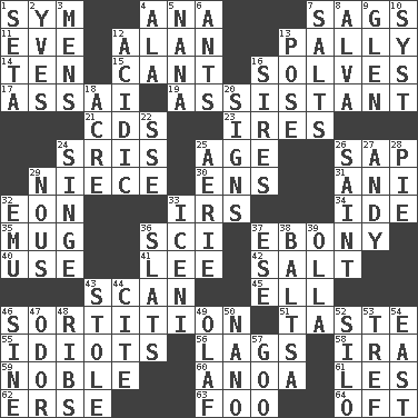 ACROSS 1. Symbol (abbr.) 4. Santa ___, CA 7. Droops 11. Night before a holiday 12. ____ Jay Lerner 13. Chummy 14. "___ Little Indians" 15. Patter 16. Finds the solution 17. Slender Brazilian palm 19. Aide 21. Music discs 23. Angers 24. Indian titles of respect 25. Ripen 26. Plant excrement 29. Sibling's daughter 30. Followers of ems 31. Black tropical American cuckoo 32. Period of immesurable duration 33. Big collection agency 34. Binary compound 35. Large cup 36. _-fi 37. Black 40. Purpose 41. Area sheltered from the wind 42. Table seasoning 43. Skim 45. Pipe bend 46. Casting lots 51. Clothes sense 55. Foolish or stupid persons 56. Fails to keep up a pace 58. Retirement account (abbr.) 59. Impressive in appearance 60. Small Philippine buffalo 61. French article 62. Celtic language 63. Egg _ yung 64. Often (poetically) DOWN 1. Bristle 2. Jacques Cousteau's middle name 3. Not women's 4. In the manner of 5. Nanny 6. Pismires 7. Table seasonings 8. Inventor's middle name 9. Small, secluded valley 10. System (abbr.) 12. Being or containing an acid 13. Airs 16. Founders of families 18. Measure of real estate 20. Attaches a signature 22. Compass dir. 24. Burn superficially 25. Nest on high 26. Inhabitant of Heaven 27. Actor Griffith 28. Sliced dessert 29. Common sense 32. Australian flightless bird 33. Ancient Celtic tribe of eastern Britain 36. Narrow boards 37. Compass dir. 38. Greek mezzo-soprano Agnes 39. Spanish pot 43. Fur scarf 44. Quote 46. Trig term 47. Scent 48. Teases 49. Norwegian king 50. Billionth: prefix 52. Grain storage tower 53. Not kosher 54. 90 degrees 57. Thick or sticky substance