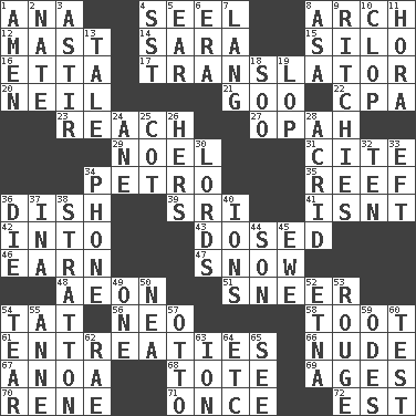 ACROSS 1. Santa ___, CA 4. Sew up the eyelids of hawks and falcons 8. Bowlike part 12. Vertical spar for supporting sails 14. "Two Mules for Sister ____" 15. Grain storage tower 16. Singer James 17. Interpreter 20. Famous astronaut Armstrong 21. Thick or sticky substance 22. Tax preparer (abbr.) 23. Arrive at 27. Brightly colored fish 29. Christmas carol 31. Quote 34. Stone: prefix 35. Coral collection 36. Food container 39. Indian title of respect (Mr.) 41. Is not 42. To the inside or interior of 43. Administered medicine 46. Merit 47. Frozen precipitation 48. Period of immesurable duration 51. Scornful expression 54. Make lace 56. Modern: prefix 58. A blast of a horn 61. Pleas 66. Naked 67. Small Philippine buffalo 68. Lug 69. Eons 70. French philosopher Descartes 71. Single time 72. Eastern Standard Time (abbr.) DOWN 1. So be it 2. Nathan's nickname 3. Moving about 4. Fast jet (abbr.) 5. Hearing organ 6. Epoch 7. Austrian-born American filmmaker Fritz 8. White ___ sheet 9. Actors Guy, Robert Welles, and Clint 10. Hoof sound 11. Israeli folk dance 13. Story 18. "Barney Miller" actor Jack 19. Trim (branches) 24. A saturated hydrocarbon 25. Small bed 26. Possessive pronoun 28. Sour-tasting 30. Titled peers of a realm 32. Nine, plus one 33. Bank Draft (abbr.) 34. Give a jingle 36. Expire 37. _ tizzy (2 wds.) 38. Ski resort town in Vermont 40. Charged atoms 44. Boy, to dad 45. She-sheep 49. Single 50. Teachers' org. 52. Inactive volcano in Sicily 53. Makeup applied to the cheeks 54. Rend 55. Queen of England 1702-14 57. Von Bismarck 59. Lyric poems 60. Trial 62. Actress Charlotte 63. Electrically charged atom 64. And so on (abbr.) 65. Perceive with the eye