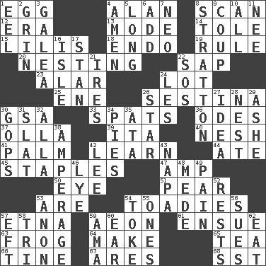 ACROSS 1. Ovum 4. ____ Jay Lerner 8. Examine minutely or intensely 12. Epoch 13. Method 14. Lacquered or enameled metalware 15. Ms. Damita and namesakes 18. Inside; within (prefix) 19. Governing power 20. Snuggling 22. Plant excrement 23. Having or resembling wings 24. Car dealer's back yard 25. Compass dir. 26. French poetic form 30. Girls' org. (abbr.) 33. Arguments over trivial matters 36. Lyric poems 37. Spanish pot 39. Call ___ day 40. Tender 41. Inside of hand 42. Memorize 44. Had dinner 45. Paper fasteners 47. Electrical Unit 50. Sight organ 51. Lightbulb-shaped fruit 53. "We ___ not amused" (Victoria) 54. Sycophants 57. Inactive volcano in Sicily 59. A really long time 61. Take place subsequently 63. Tree-dwelling hopper 64. Create 65. Beverage made from leaves 66. Prong on a fork 67. Ancient Greek god of war 68. Fast jet (abbr.) DOWN 1. Snakelike fish 2. Broad smile 3. An organ shaped like a helmet 4. So be it 5. Protracted 6. Find the sum of 7. Modern: prefix 8. Ski resort town in Vermont 9. Overturn; upset 10. Everything 11. Born 16. Small island 17. Comedian Laurel of Laurel & Hardy 21. Angers 22. Distress signal 24. French article 26. Play the lead 27. The main thing one is thinking about 28. A home for chicks 29. American tennis player Robert 30. Republicans 31. Narrow board 32. Silent film actress Nazimova 34. Sliced desserts 35. "One Day ___ Time" 38. Electrical Measurement 42. Area sheltered from the wind 43. California wine valley 46. Potassium hydroxide 48. Ancient Persian 49. Ache 52. Musical pauses 53. At once, immediately (arch.) 54. Casino tip 55. Singles 56. Takes to court 57. Lizard (obsolete) 58. Three (prefix) 59. Nanny (var.) 60. Hearing organ 62. Ingest