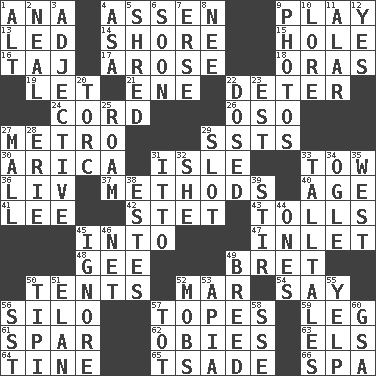 ACROSS 1. Santa ___, CA 4. NE Netherlands city 9. Live dramatic performance 13. Directed 14. Dinah or Pauly 15. Opening into or through something 16. _ Mahal 17. Came up 18. Mouths or openings 19. Allow 21. Compass dir. 22. Prevent from occurring 24. Drawstring 26. Bear (Spanish) 27. Paris' subway 29. Fast planes 30. N. Chile seaport 31. Small island 33. Pull behind 36. 54 in ancient Rome 37. Modes 40. Mature 41. Area sheltered from the wind 42. Proofreading order 43. For Whom the Bell _____ 45. To the inside or interior of 47. An arm off of a larger body of water 48. Turn to the right 49. Cy Young winner Saberhagen 50. Portable shelters 52. Third mo. 54. Declare 56. Grain storage tower 57. Drinks excessively 59. Part of a journey 61. Practice fight 62. Off-Broadway awards 63. Raised railways 64. Prong on a fork 65. Sadhe (variant) 66. Health resort DOWN 1. The first octave above the treble staff 2. Actress Patricia 3. Descriptive word 4. White ___ sheet 5. Tear up 6. Within a short period 7. Celtic language 8. Born 9. Pictures 10. Old wives' tales, e.g. 11. Having or resembling wings 12. It is so 20. Torque (variant) 22. Administered medicine 23. Eastern Standard Time (abbr.) 25. Wander aimlessly 27. Shopping center 28. One of the Great Lakes 29. Position in a hierarchy or organization 31. "Tell ____ the Marines!" 32. A female animal or person 33. Baron Munchausen's specialties 34. Stare at amorously 35. Compass direction 38. _____ Park, CO 39. Tumult 44. Singles 45. Refuse to acknowledge 46. Remaining after all deductions 49. A special lineage 50. Native american tent (variation) 51. Liveliness 52. Crowds into 53. Capital of Western Samoa 55. Sharp bark 56. Fast jet (abbr.) 57. Small child 58. Compass dir. 60. Girls' org. (abbr.)