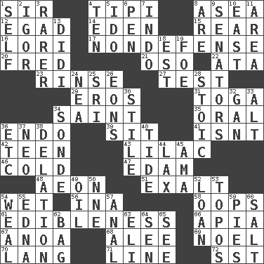 ACROSS 1. Title for a knight 4. Native american tent (variation) 8. Toward the sea 12. Mild oath 14. Paradise 15. Tail end 16. Australian parrot (variant) 17. Unrelated to defense, as in spending 20. Flintstone 21. Bear (Spanish) 22. _ moment's notice (2 wds.) 23. Remove soap 27. Trial 29. Greek god of love 31. Ancient Roman robe 34. Inhabitant of Heaven 35. Taken by mouth 36. Inside; within (prefix) 39. Be seated 41. Is not 42. Adolescent 43. Pale purple color 46. Having a low temperature 47. Dutch treat 48. Period of immesurable duration 51. Honor 54. Soggy 56. _ tizzy (2 wds.) 58. I made a mistake 61. The property of being fit to eat 66. Capital of Western Samoa 67. Small Philippine buffalo 68. Toward shelter 69. Christmas carol 70. Austrian-born American filmmaker Fritz 71. Actor's bit 72. Fast jet (abbr.) DOWN 1. Automatically 2. Composer Stravinsky 3. More uncommon 4. Nine, plus one 5. Wedding promise 6. Animal enclosure 7. Southeast Asian peninsula 8. "We ___ not amused" (Victoria) 9. Elected representatives 10. 90 degrees 11. Type of rug 13. "You Light Up My Life" star Conn 18. Eastern Standard Time (abbr.) 19. Enemy 24. Teachers' org. 25. Indian title of respect (Mr.) 26. Immeasurably long periods of time 28. Unemotional 30. Vertical member of a panel or frame 32. Separate the seeds from cotton 33. Keyboard modifier key 34. Message 36. And so on (abbr.) 37. Modern: prefix 38. Accusation by an informer 40. Event that recurs at intervals 44. Not strict 45. Nursemaid (var.) 49. Petroleum 50. Compass dir. 52. Grant temporary use of 53. Traditional theme or motif 54. Welt 55. Pulitzer Prize-winning author Ferber 57. Of or related to the anus 59. Sliced desserts 60. Table seasoning 62. Paper or plastic container 63. Connecticut Ivy Leaguer 64. Elected rep. 65. Observe