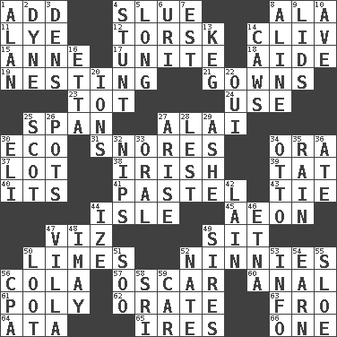 ACROSS 1. Increase 4. Change direction abruptly 8. Chicken ___ king 11. Potassium hydroxide 12. Cod relative 14. 154 in Roman numerals 15. Singer Murray 17. Join together 18. Helper 19. Snuggling 21. Women's formal wear 23. Small child 24. Purpose 25. Connect, as a bridge 27. Mountain range southwest of Kyrgyzstan 30. Environmental prefix 31. Sounds asleep 34. Mouth or opening 37. Car dealer's back yard 38. From or relating to Ireland 39. Make lace 40. ___ a Wonderful Life 41. Soft color 43. Standoff 44. Small island 45. Period of immesurable duration 47. Namely 49. Be seated 50. Citrus fruits 52. Fools 56. Root beer relative 57. Witty Wilde 60. Of or related to the anus 61. Much (prefix) 62. Speak pompously 63. From 64. "One Day ___ Time" 65. Angers 66. Single DOWN 1. Actor Alda or Thicke 2. Unit of force 3. Hiding places for outlaws 4. Check the growth or development of 5. Having great length 6. RI univ. 7. Eastern Standard Time (abbr.) 8. Place in a line 9. Hats (slang) 10. "___ Maria" 13. Cask 14. Crow sounds 16. Singer James 20. Charged particles 22. Fr. "Yes" 25. Native of Scotland 26. Cooking vessels 27. Originate 28. For fear that 29. American tennis player Robert 30. Connecticut Ivy Leaguer 32. Cuts off 33. Of the mouth 34. Von Bismarck 35. Precipitation 36. Had dinner 42. (Had) reclined 44. Ending with capital 46. Inactive volcano in Sicily 47. Country estate 48. "If ____ say so..." 49. Founders of families 50. Plunder 51. "Barney Miller" actor Jack 52. Nathan's nickname 53. A message received and understood 54. Merit 55. A type of plum 56. Accounting whiz (abbr.) 58. Indian title of respect (Mr.) 59. 4-wheeled motor vehicle
