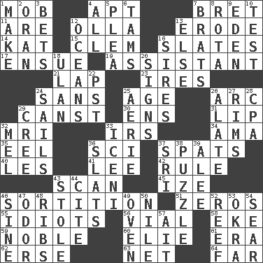 ACROSS 1. Crowd into 4. Fitting 7. Cy Young winner Saberhagen 11. "We ___ not amused" (Victoria) 12. Spanish pot 13. Eat (away) 14. Krazy ___ of comics 15. Clement's nick name 16. Chalkboards 17. Follow as a consequence or result 19. Aide 21. Pet locale 23. Angers 24. Without 25. Personal question 26. Curve 29. 2nd pers. sing. pres. of can (arch.) 30. Followers of ems 31. Mouth edge 32. Medical imaging device (abbr.) 33. Big collection agency 34. Wet nurse (var.) 35. Snakelike fish 36. _-fi 37. Arguments over trivial matters 40. French article 41. Area sheltered from the wind 42. General guideline 43. Skim 45. Ending with capital 46. Casting lots 51. Nothings 55. Foolish or stupid persons 56. Small bottle 58. Make supply last 59. Having high moral qualities 60. Writer Wiesel 61. Period 62. Celtic language 63. Fish or hair follower 64. At a great distance DOWN 1. Create 2. NW Algerian seaport 3. Antes 4. Everything 5. Entreaty 6. Scottish caps 7. Naughty children 8. Round or rotation of duties 9. Genesis locale 10. Trial 12. Seas 13. Otherwise 16. Begets 18. ____ Bator, Mongolia 20. Signals 22. Pacific Standard Time (abbr.) 24. Moves on water 25. Nest on high 26. Having winglike extensions 27. Basketball hoops 28. Accounting whiz (abbr.) 29. Algonquian 32. Cartoonist voice _ Blanc 33. Ancient Celtic tribe of eastern Britain 36. Narrow boards 37. Indian title of respect (Mr.) 38. What's this? 39. Toward shelter 43. Fur scarf 44. Quote 46. Trig term 47. Scent 48. Chest bones 49. Baking chamber 50. The longest river in the world 52. Coral collection 53. Gumbo ingredient 54. Shrivel 57. Small island