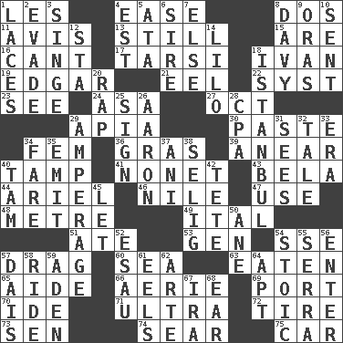 ACROSS 1. French article 4. Comfort 8. Two (Sp.) 11. Opinion 13. Not moving 15. "We ___ not amused" (Victoria) 16. Patter 17. Tarsus (plural) 18. "Terrible" tsar 19. _ Allan Poe 21. Snakelike fish 22. System (abbr.) 23. Observe 24. White ___ sheet 27. Sep. follower 29. Capital of Western Samoa 30. Thick mixture 34. Opposite of masc. 36. Pate de foie ____ 39. Approach 40. Pack (down) 41. Music written for nine 43. Actor Lugosi 44. Satellite of Uranus 46. "Death on the ____" 47. Purpose 48. Distance measurement (Brit.) 49. Slanted text style (abbr.) 51. Had dinner 53. Commissioned military rank (abbr.) 54. Compass dir. 57. To draw with force 60. Ocean 63. Ingested 65. Helper 66. Nest on high 69. Left side of a ship or aircraft 70. Binary compound 71. Extreme 72. Hoop that covers a wheel 73. Elected rep. 74. Burn superficially 75. 4-wheeled motor vehicle DOWN 1. Shoestrings 2. Dodge 3. Scorch 4. Eastern Standard Time (abbr.) 5. "One Day ___ Time" 6. The founder of a family 7. Otherwise 8. American folk hero Crockett 9. Mouths or openings 10. Posted 12. R.R. building 14. _ and Stitch 18. Byzantium, centuries later 20. Reproach for some lapse or misdeed 25. Omen 26. Composer Copland 28. Tax preparer (abbr.) 29. Electrical Measurement 31. Perceives with the eye 32. Lie 33. Period 34. Conductor's collection 35. Give off 37. Cuckoo 38. Former Milwaukee Brewers owner Bud 40. Scottish cap 42. False hair 45. Allow 50. One (Scot) 52. Son of Isaac 54. Unemotional 55. Father Junipero _ 56. Keyboard key 57. Raised platform 58. Travel on an animal 59. Arabian gulf 61. Snakelike fish 62. Johnson of "Laugh-In" 64. Fitting 67. Retirement account (abbr.) 68. Hearing organ