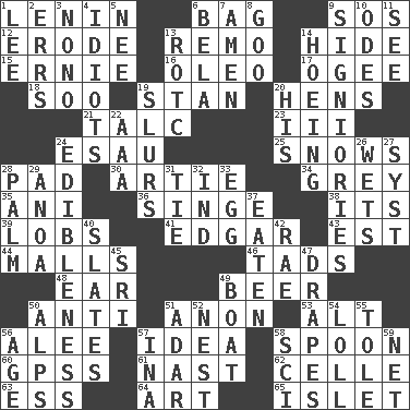 ACROSS 1. Soviet premier 1918-24 6. Container for groceries 9. Distress signal 12. Eat (away) 13. San ____ (Riviera town) 14. Flintstone garb 15. Bert's buddy 16. Butter sub 17. Double curve, resembling the letter S 18. "Barney Miller" actor Jack 19. Comedian Laurel of Laurel & Hardy 20. Coop moms 21. Baby powder 23. One more than two 24. He sold his birthright 25. Overwhelms 28. Writing tablet 30. Nick name for Arthur 34. Jennifer or Joel 35. Cuckoo 36. Scorch 38. It is 39. Tennis shots 41. _ Allan Poe 43. Eastern Standard Time (abbr.) 44. Shopping centers 46. Small boys 48. Ewer handle 49. Fermented drink made from hops 50. Against 51. Soon (poet.) 53. Keyboard modifier key 56. Toward shelter 57. The main thing one is thinking about 58. Soup utensil 60. Global Positioning Systems (abbr.) 61. Political cartoonist Thomas 62. Cell (Danish) 63. Curvy letter 64. Tate display 65. Small island DOWN 1. Area sheltered from the wind 2. Blunders 3. Words to Nanette 4. Foolish or stupid persons 5. Born 6. Actor Lugosi 7. So be it 8. Thick or sticky substance 9. Seigniories (variant) 10. Lyric poems 11. Perceive with the eye 13. College mil. group 14. Cultivating 19. Runs notes together 20. Part of HMS, perhaps 22. Auto club (abbr.) 24. The property of being fit to eat 26. Soaks 27. System (abbr.) 28. Inside of hand 29. Small Philippine buffalo 31. Standoff 32. Working for oneself (abbr.) 33. Ovum 37. Eroded 40. Chalkboards 42. Actress Charlotte 45. Indian title of respect (Mr.) 47. Window treatments 49. Water vessel 50. High mountains 51. The sixth month of the Jewish calendar 52. A home for chicks 54. Hang loosely or laxly 55. Lacquered or enameled metalware 56. Grow older 57. _ tizzy (2 wds.) 58. _-fi 59. Remaining after all deductions
