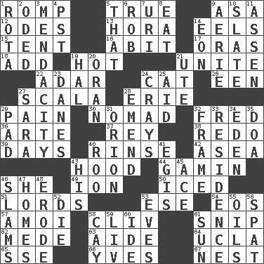 ACROSS 1. Play 5. Loyal 9. White ___ sheet 12. Lyric poems 13. Israeli folk dance 14. Snakelike fish 15. Portable shelter 16. "This won't hurt ____!" 17. Mouths or openings 18. Increase 19. Being at a high temperature 21. Join together 22. The sixth month of the Jewish calendar 24. Feline 26. Car or cant ending 27. Any of the three canals of the cochlea 28. 4th largest of the Great Lakes 29. Ache 30. Wanderer 32. Flintstone 36. Johnson of "Laugh-In" 37. Marina Del _, California 38. Do over again 39. 24-hour periods 40. Wash lightly 42. At sea 43. Parka part 44. Homeless child 46. A female animal or person 49. Electrically charged atom 50. On the rocks 51. Nobles 53. Compass dir. 54. Greek goddess of the dawn 57. Mine, in Marseilles 58. 154 in Roman numerals 61. Sever or remove by pinching or nipping 62. Ancient Persian 63. Assistant 64. Southern CA. univ. 65. Compass dir. 66. Jacques Cousteau's middle name 67. Egg locale DOWN 1. Round or rotation of duties 2. Wrote a lyric poem 3. Ananias' fault 4. Pacific Standard Time (abbr.) 5. Not this but _ 6. Director Reiner 7. RI univ. 8. Erode 9. Nest on high 10. Schedule 11. NE Netherlands city 14. A really long time 19. Actor Linden 20. Northwest Algerian city 21. Shoshoni 23. Natives or inhabitants of Denmark 24. Trading vessels 25. Help 27. "Two Mules for Sister ____" 28. Make improvements or corrections to 29. Writing tablet 31. Constellation of myth 32. Movie unit 33. Dwelling 34. Locale of original sin 35. ___ good deed 40. Friend of Pooh 41. The front part of a cuirass 43. Part of HMS, perhaps 45. Adept person 46. Hits or strikes with great force 47. Residences 48. Wear away 52. Pass on 53. Nights before holidays 55. Petroleums 56. Petty quarrel 58. Island 59. 54 in ancient Rome 60. Binary compound 61. Player for Phoenix