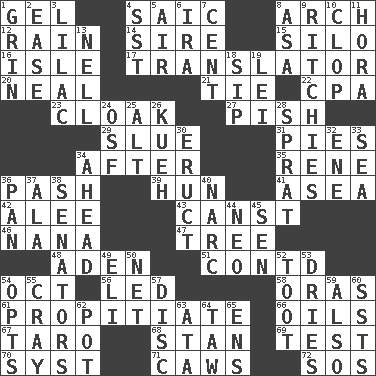 ACROSS 1. Set 4. Ketch in the Levant 8. Bowlike part 12. Precipitation 14. The founder of a family 15. Grain storage tower 16. Capri or Wight 17. Interpreter 20. Actress Patricia 21. Neckwear 22. Accounting whiz (abbr.) 23. Loose outer garment 27. Expression of disdain 29. Change direction abruptly 31. Sliced desserts 34. Following 35. French philosopher Descartes 36. Romantic infatuation 39. Attila the _ 41. At sea 42. Toward shelter 43. 2nd pers. sing. pres. of can (arch.) 46. Grandmother 47. Relationship diagram 48. Arabian gulf 51. Continued (abbr.) 54. Sep. follower 56. Directed 58. Mouths or openings 61. Appease 66. Petroleums 67. Pacific island yam 68. Comedian Laurel of Laurel & Hardy 69. Trial 70. System (abbr.) 71. Crow sounds 72. Mayday DOWN 1. Smile widely 2. Comfort 3. Pale purple color 4. Fast jet (abbr.) 5. Wind 6. Retirement account (abbr.) 7. Penny 8. White ___ sheet 9. Actors Guy, Robert Welles, and Clint 10. Hoof sound 11. Israeli folk dance 13. 1994 drama film starring Jodie Foster 18. Small drink 19. Luau accessory 24. Order of Saint Francis (abbr.) 25. The first octave above the treble staff 26. Malaysian steamed pastry 28. Small fatty European fish 30. Spew [out] 32. Compass dir. 33. Ocean 34. Having the leading position 36. Baking dish 37. Wing 38. Legislators 40. Drug cop 44. Modern: prefix 45. Elected rep. 49. Biblical high priest 50. Remaining after all deductions 52. A blast of a horn 53. Frees from moisture 54. Elects 55. Supercomputer manufacturer 57. Plate 59. In addition 60. Fast planes 62. Cooking vessel 63. _ moment's notice (2 wds.) 64. The 23rd letter of the Hebrew alphabet 65. Followers of ems