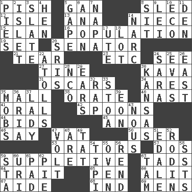 ACROSS 1. Expression of disdain 5. Separate the seeds from cotton 8. Downhill vehicle 12. Small island 13. Santa ___, CA 14. Sibling's daughter 15. Style 16. Census information 19. Arrange properly for use 20. Legislator 21. Lacerate 23. And so on (abbr.) 24. Perceive with the eye 27. Prong on a fork 30. Polynesian shrub of the pepper family 31. Motion picture awards 34. Ancient Greek god of war 35. Shopping center 38. Declaim 40. Political cartoonist Thomas 41. Taken by mouth 42. Soup utensils 44. Auction offers 45. Small Philippine buffalo 46. Declare 47. Large container 50. One who makes use of a thing 53. Speakers 57. Two (Sp.) 59. Supplying deficiencies 63. Small boys 64. Distinguishing feature 65. Writing instrument 66. Set down 67. Assistant 68. Indiana (abbr.) 69. Not women's DOWN 1. Sliced desserts 2. Small island 3. Schedule 4. Layer 5. Yawn 6. Soon (poet.) 7. California wine valley 8. Be seated 9. Flowery wreath 10. Environmental prefix 11. Lair 14. Drug cop 17. Shoshoni 18. Car dealer's back yard 20. Indian titles of respect 22. Ringlike coral islands and reefs 24. "Two Mules for Sister ____" 25. Nights before holidays 26. 90 degrees 28. Non-commissioned officer (abbr.) 29. Hearing organs 30. Sunflower state 32. Reproach for some lapse or misdeed 33. Portico 35. Disorderly crowds 36. Operatic vocal solo 37. Kenny Rogers chart-topper in '80 39. Period of immesurable duration 43. Good sense 47. Electrical Unit 48. "We ___ not amused" (Victoria) 49. Make lace 51. Peak District village in England 52. "The Thinker" sculptor 54. Native american tent (variation) 55. Baking chamber 56. Tear apart 58. Fast planes 59. R.R. building 60. RI univ. 61. Writing tablet 62. Sliced dessert 63. Scottish cap