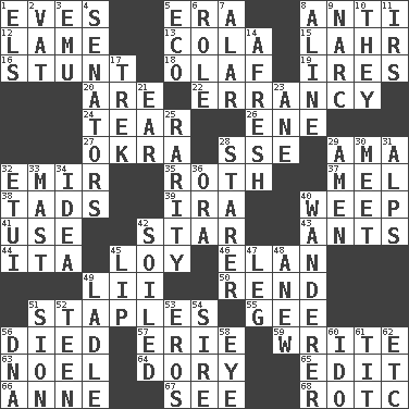 ACROSS 1. Nights before holidays 5. Period 8. Against 12. Unable to walk 13. Root beer relative 15. Cowardly lion portrayer 16. Check the growth or development of 18. Norwegian king 19. Angers 20. "We ___ not amused" (Victoria) 22. Tendancy to err 24. Rend 26. Compass dir. 27. Gumbo ingredient 28. Compass dir. 29. Nursemaid (var.) 32. Arab leader 35. Writer of Portnoy's Complaint (1969) 37. Cartoonist voice _ Blanc 38. Bits 39. Retirement account (abbr.) 40. Shed a tear 41. Purpose 42. Play the lead 43. Pismires 44. Call ___ day 45. Myrna of the movies 46. Liveliness 49. Cards in a Roman deck? 50. Tear apart 51. Paper fasteners 55. Turn to the right 56. Passed on 57. 4th largest of the Great Lakes 59. Compose 63. Christmas carol 64. Rowboat 65. Prepare for publication 66. Queen of England 1702-14 67. Observe 68. College mil. group DOWN 1. Raised railways 2. Large container 3. Australian flightless bird 4. Elected representatives 5. Environmental prefix 6. Hero or heavy, e.g. 7. Having or resembling wings 8. Place in a line 9. Drug cop 10. Those people 11. Big collection agency 14. Anew 17. Long journey 21. Ewer handle 23. A saturated hydrocarbon 25. Noteworthy scarcity 28. A viewer who gazes fixedly 29. So be it 30. Confront 31. High mountains 32. Needle holder 33. Vertical spar for supporting sails 34. It may be bright or harebrained 36. Mouth or opening 40. Roamer 42. Dirtied 45. Mouth edge 47. Part of a journey 48. Afresh 49. Dipping utensil 51. The Jewish people; Israel 52. Adolescent 53. Greek god of love 54. The founder of a family 56. Heredity factor (abbr.) 58. Sight organ 60. Wedding promise 61. Teat (slang) 62. And so on (abbr.)