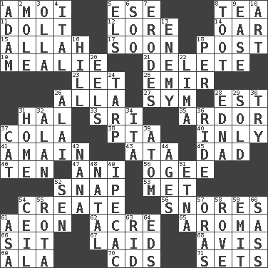 ACROSS 1. Mine, in Marseilles 5. Compass dir. 8. Afternoon social gathering 11. Stupid person 12. Old wives' tales, e.g. 14. Boat paddle 15. Assad's deity 17. Within a short period 18. Mail 19. Ear of corn 21. Keyboard key 23. Allow 25. Independent ruler or chieftain 26. Silent film actress Nazimova 27. Symbol (abbr.) 28. Eastern Standard Time (abbr.) 31. Actor Linden 33. Indian title of respect (Mr.) 35. Zeal 37. Root beer relative 38. Parent Teacher Association (abbr.) 40. Inwardly 41. With great haste 43. _ moment's notice (2 wds.) 45. June honoree 46. Nine, plus one 47. Black tropical American cuckoo 50. Double curve, resembling the letter S 52. Fastener 53. Was introduced to 54. Cause to be 56. Sounds asleep 61. A really long time 62. 1/640 square mile 65. Odor 66. Be seated 67. Put down 68. Opinion 69. Wing 70. Music discs 71. Arranges properly for use DOWN 1. First man 2. Undercover agent 3. Rounded earthenware pot or jar 4. Slanted text style (abbr.) 5. Raised railways 6. "Barney Miller" actor Jack 7. Eats (away) 8. A blast of a horn 9. Comfort 10. Tate display 13. Foe 16. Land elevation 18. For each 20. Snakelike fish 22. Pale green bean 24. Canvas cover 26. Jai _ 28. Pulitzer Prize-winning author Ferber 29. Disposed of to a purchaser 30. Attempt 31. Dwelling 32. ____ Jay Lerner 34. Call ___ day 36. Travel on an animal 37. Feline 39. Tiny particle 42. Nanny 44. Eons 48. Brizilian seaport 49. Medicinal drug used to evoke vomiting 51. Inactive volcano in Sicily 52. Elected rep. 54. To provide with a ceiling 55. Roll call or roster of names 57. Mouths or openings 58. Be footloose 59. Give off 60. Backtalk 61. White ___ sheet 63. To free from 64. Begley and Asner