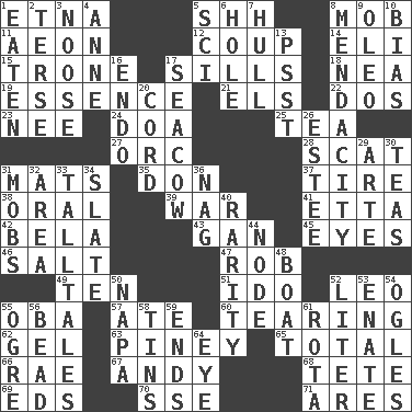 ACROSS 1. Inactive volcano in Sicily 5. Quiet! 8. Crowd into 11. Period of immesurable duration 12. Overturn; upset 14. Biblical high priest 15. Heavy duty weighing machine 17. Beverly of Met fame 18. Teachers' org. 19. Center 21. Raised railways 22. Two (Sp.) 23. Born 24. ___ good deed 25. Beverage made from leaves 27. The grampus (Milton) 28. Jazz singing style 31. Floor protectors 35. Spanish title 37. Hoop that covers a wheel 38. Relating to the mouth 39. Armed conflict 41. Singer James 42. Actor Lugosi 43. Separate the seeds from cotton 45. Sight organs 46. Table seasoning 47. Director Reiner 49. "___ Little Indians" 51. Wedding promise 52. Lion 55. Chief or king in Benin or Nigeria 57. Had dinner 60. Pulling apart 62. Set 63. Abounding in pines 65. Add up to 66. Actress Charlotte 67. "60 Minutes" Commentator Rooney 68. False hair 69. Begley and Asner 70. Compass dir. 71. Ancient Greek god of war DOWN 1. Eroded 2. Laconic 3. Trap for birds or small mammals 4. Singer Murray 5. _-fi 6. Hollow 7. Frame or body of a ship 8. Ananias' fault 9. Butter sub 10. Prejudice 13. Inconspicuous attention getter 16. Inside; within (prefix) 17. Manatee 20. Drawstring 26. First name in cosmetics 29. Johnson of "Laugh-In" 30. Afternoon social gatherings 31. Crowds into 32. Type of rug 33. Baron Munchausen's specialties 34. Chalkboard 36. Tired old horse 40. Noteworthy scarcity 44. Connecting point 48. Water vessel 50. California wine valley 52. 61 cubic inches 53. Maternal 54. Stares at amorously 55. Legendary monster 56. Necklace unit 58. Metal containers 59. Extremities 61. Roll call or roster of names 64. Sight organ