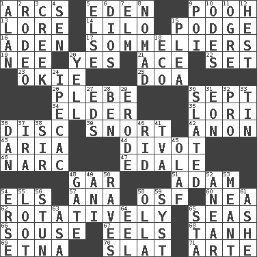 ACROSS 1. Curves 5. Paradise 9. "Silly old bear" 13. Old wives' tales, e.g. 14. _ and Stitch 15. Porridge 16. An important port of Yemen 17. Wine waiters 19. Born 20. Consenting reply 21. Adept person 22. Arrange properly for use 23. Migrant worker of the '30s 25. ___ good deed 26. Cadet 30. Back-to-school mo. 34. A person who is older than you are 35. Australian parrot (variant) 36. Flat circle 39. Derisive sound 42. At once, immediately (arch.) 43. Roberta Peters solo 44. A piece of turf (Scot.) 46. Drug cop 47. Peak District village in England 48. Slender fish 51. First man 54. Raised railways 57. Santa ___, CA 58. Order of Saint Francis (abbr.) 60. Teachers' org. 62. Producing rotation 65. Oceans 66. Boozer 67. Snakelike fish 68. Hyperbolic tangent 69. Inactive volcano in Sicily 70. Narrow board 71. Johnson of "Laugh-In" DOWN 1. ____ Jay Lerner 2. Cowboy competition 3. Small stream 4. Elected rep. 5. Otherwise 6. "Vaya con ____" 7. Shade tree 8. Roamer 9. Luau course 10. Lyric poems 11. Legendary monster 12. Command 15. Entreaty 18. Environmental prefix 20. Shout 24. Medicinal drug used to evoke vomiting 27. Begley and Asner 28. Benjamin's nick name 29. Wear away 30. Scheduled 31. Period of immesurable duration 32. Adept person 33. Metal container 36. One of the 12 tribes of Israel 37. Lyricist Gershwin 38. Title for a knight 40. To free from 41. Federal power corp. 45. Norwegian king 48. Yard entry 49. Black tropical American cuckoo 50. All-night dance parties 52. Approach 53. Intended 54. Celtic language 55. Plunder 56. Astound 58. Spanish pot 59. System (abbr.) 61. American tennis player Robert 63. White ___ sheet 64. Snakelike fish 65. R.R. building