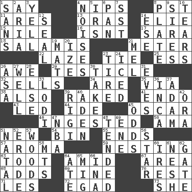 ACROSS 1. Declare 4. Cuts off 8. Pacific Standard Time (abbr.) 11. Ancient Greek god of war 13. Mouths or openings 14. Writer Wiesel 15. "Death on the ____" 16. Is not 17. "Two Mules for Sister ____" 18. Deli grouping 21. Distance measurement 22. Goldbrick 23. Make a knot 25. Curvy letter 26. Deep reverence 29. A testis 32. Makes a sale 34. "We ___ not amused" (Victoria) 35. By way of 38. In addition 39. Swept the length of 41. Inside; within (prefix) 43. Directed 44. Binary compound 45. Motion picture award 46. Consumed 50. Wet nurse (var.) 51. ___ Haven, CT 54. Storage container 55. Extremities 57. Scent 59. Nestling 63. A blast of a horn 64. Among 67. Length times width 68. Does sums 69. Prong on a fork 70. State of inaction 71. French article 72. Mild oath 73. A female animal or person DOWN 1. Without 2. Operatic vocal solo 3. Shout 4. Annoying sounds 5. Big collection agency 6. Baking dish 7. Fast jet (abbr.) 8. Food holder 9. Founders of families 10. Pulls into pieces 12. Lick closed 14. Compass dir. 19. Floor coverings 20. Ending with capital 21. Cartoonist voice _ Blanc 23. Hoop that covers a wheel 24. On the rocks 26. White ___ sheet 27. Water source 28. Otherwise 30. Receives possession of 31. Nights before holidays 33. Farming town in central California 36. South American Indian 37. First of billions? 39. Swiss mountan, "Queen of the Mountains" 40. Arabian gulf 42. Mouth or opening 45. Probability 47. Basketball assoc. 48. Watched over 49. Compass dir. 51. Brizilian seaport 52. Eat (away) 53. Forest 56. Play the lead 58. Mountains (abbr.) 60. Angers 61. Tender 62. Yard entry 64. Had dinner 65. Russian fighter aircraft 66. _ tizzy (2 wds.)
